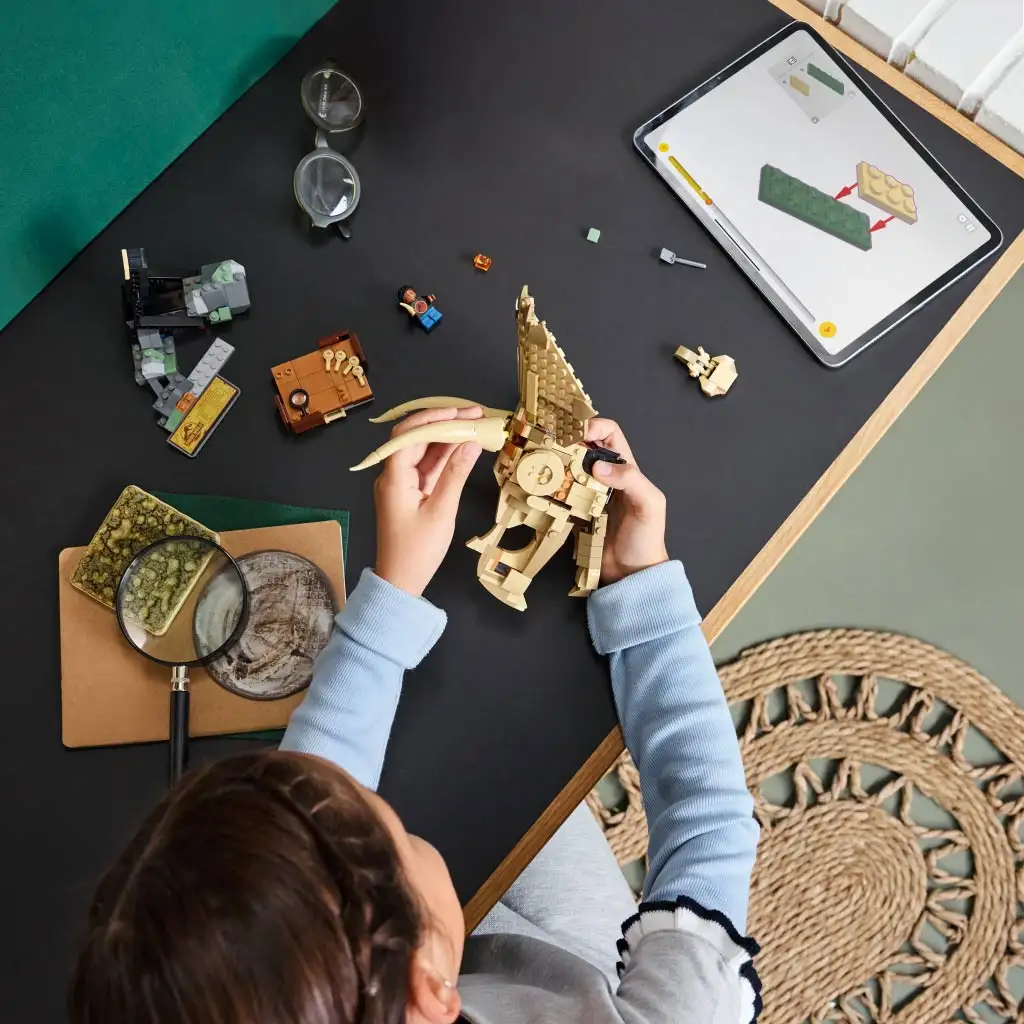 Nastavljiva Triceratopsova lobanja – Otroci lahko lobanjo postavijo z odprto ali zaprto čeljustjo in se odločijo, ali jo bodo razstavili na stojalu ali skupaj z minifiguro, osnovno ploščo z izkopavanjem, mini najdbami in orodji za izkopavanje.