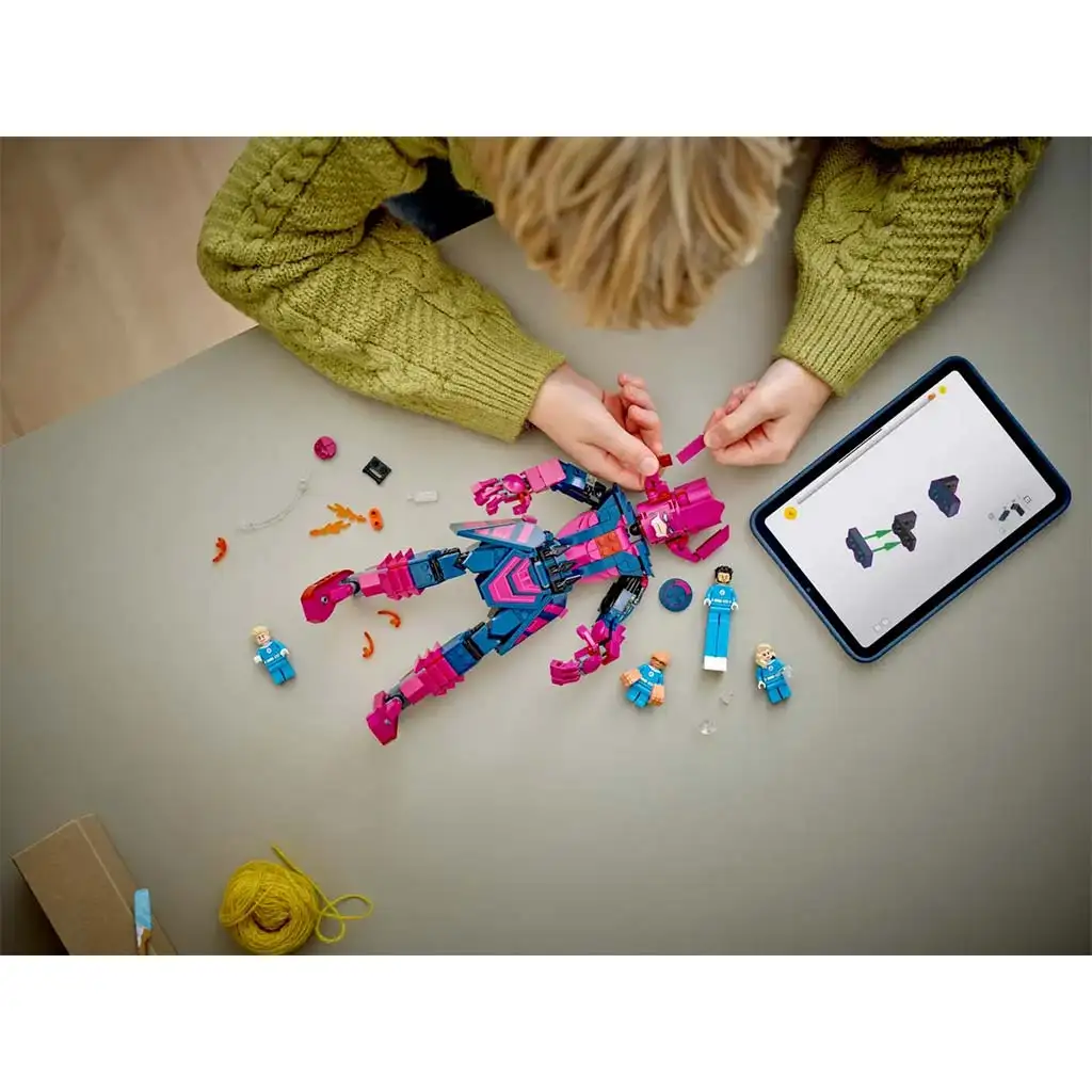 Sestavljiva LEGO ǀ Marvel igrača Fantastičnih štirih vsebuje 4 minifigurice: Gospod Fantastični z raztegljivimi nogami, Človeška bakla z dvema ročnima topovoma, ognjenimi elementi na nogah in prozornim podstavkom, da lahko "leti"; Nevidna ženska, ki drži 2 energetska ščita; in Stvor z ogromnima in močnima rokama. Kultni zlikovec iz filma, Galactus, ima nastavljivo sestavljivo figuro, visoko 28 cm. Nastavljiva figura se bori s superjunaki in ponuja obilo akcije. Za dodatno digitalno izkušnjo lahko graditelji povečujejo in vrtijo modele v 3D ter spremljajo svoj napredek v zabavni in intuitivni aplikaciji LEGO® Builder. Komplet vsebuje 427 kosov.