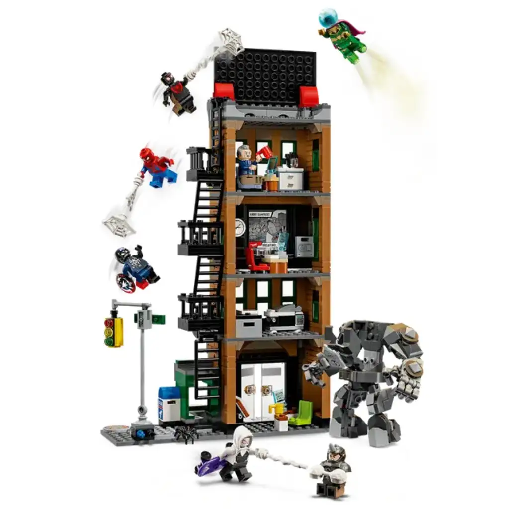 Odkrij superjunaška doživetja na 4 nivojih s kompletom Spider-Man vs. Mysterio: Daily Bugle (76342), ki je namenjen fantom, dekletom in otrokom, starim 10 let ali več, kot pajkmanovski gradbeni set. Ta zbirateljski pajkmanovski gradbeni komplet je pravi užitek sestavljati in razstavljati, poleg tega pa je igra z njim zelo zabavna, saj je poln LEGO® ǀ Marvel minifiguric in pustolovščin. Komplet Marvel ǀ Daily Bugle vključuje minifigurice Spider-Mana, Milesa Moralesa, Ghost Spider, J. Jonaha Jamesona, Mysterija, venomiziranega Kapitana Amerike in Rhina, akcije v zraku pa omogočajo 3 prozorne palice in 2 prozorna kocka. Del kompleta je tudi Rhino-robot, ki ima odpirajočo kabino. V podrobno izdelani notranjosti stavbe najdeš pisarne, recepcijo, uredniške stroje, sef za denar in ročico za menjavajoče se novice na tablo. Zunaj sta zasilni izhod, premičen časopisni stojalo in ulični kot z semaforji. Prenesi aplikacijo LEGO® Builder, da boste s funkcijo »Gradite skupaj« doživeli izkušnjo skupaj s prijatelji in družino! Komplet vsebuje 781 kosov.