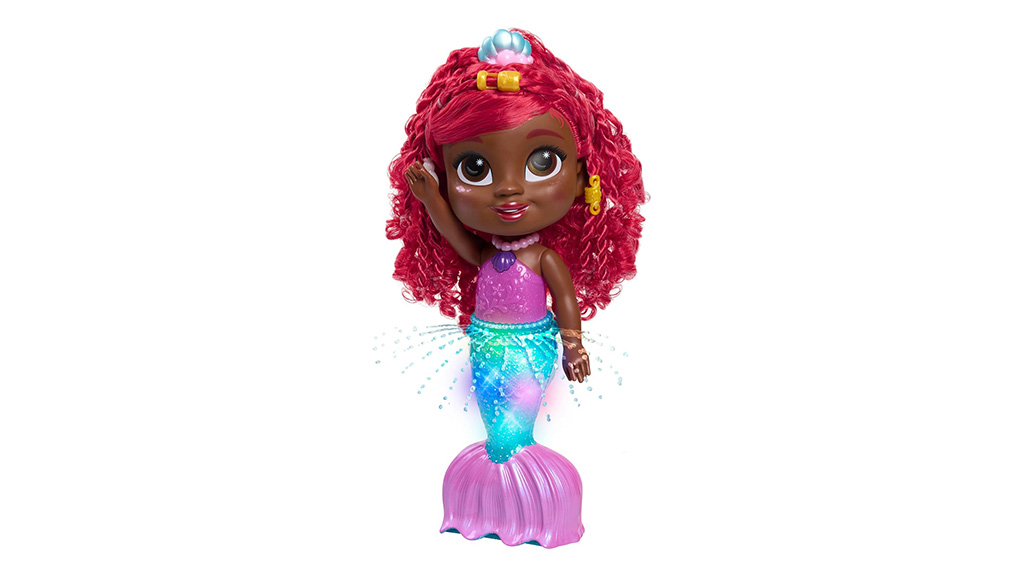 Disney Junior Splash & Glow Ariel lutka od Just Play, zasnovana za otroke, stare 3 leta in več, je prilagodljiva s priloženimi lasnimi biseri in tiaro. Otroci lahko pritisnejo na školjko ogrlico lutke, da slišijo zvočne učinke in novo tematsko pesem oddaje. Ko pride v stik z vodo, Arielin rep sveti v mavričnih barvah in brizga vodne curke v obliki krila.