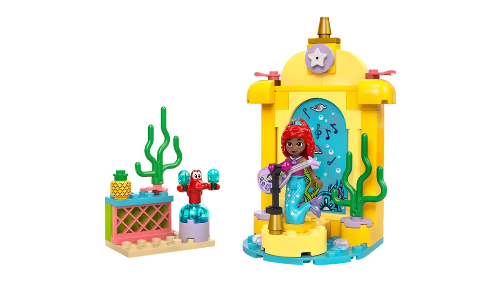 Ta 141-delni komplet za gradnjo morske deklice vsebuje figure Ursule, Ariela in Flounderja. Komplet vključuje jamo z vrtljivo platformo, "vozilo kit" in "razbitino ladje". Datum izdaje: 1. julij.Ustvarj glasbo z Ariel in Sebastianom! Ta 60-delni LEGO komplet vsebuje vrteči se plesišče, osvežilni kotiček in celotno zbirko LEGO dodatkov. Komplet bo izšel 1. julija.LEGO širi zbirko izdelkov Ariel z dvema novima kompletoma. Komplet Arielina kristalna jama vsebuje 141 kosov in je priporočljiv za male graditelje od 4. leta starosti. Komplet vključuje LEGO Disney minifigure Ursule in Ariel ter LEGO figuro Flanderja.