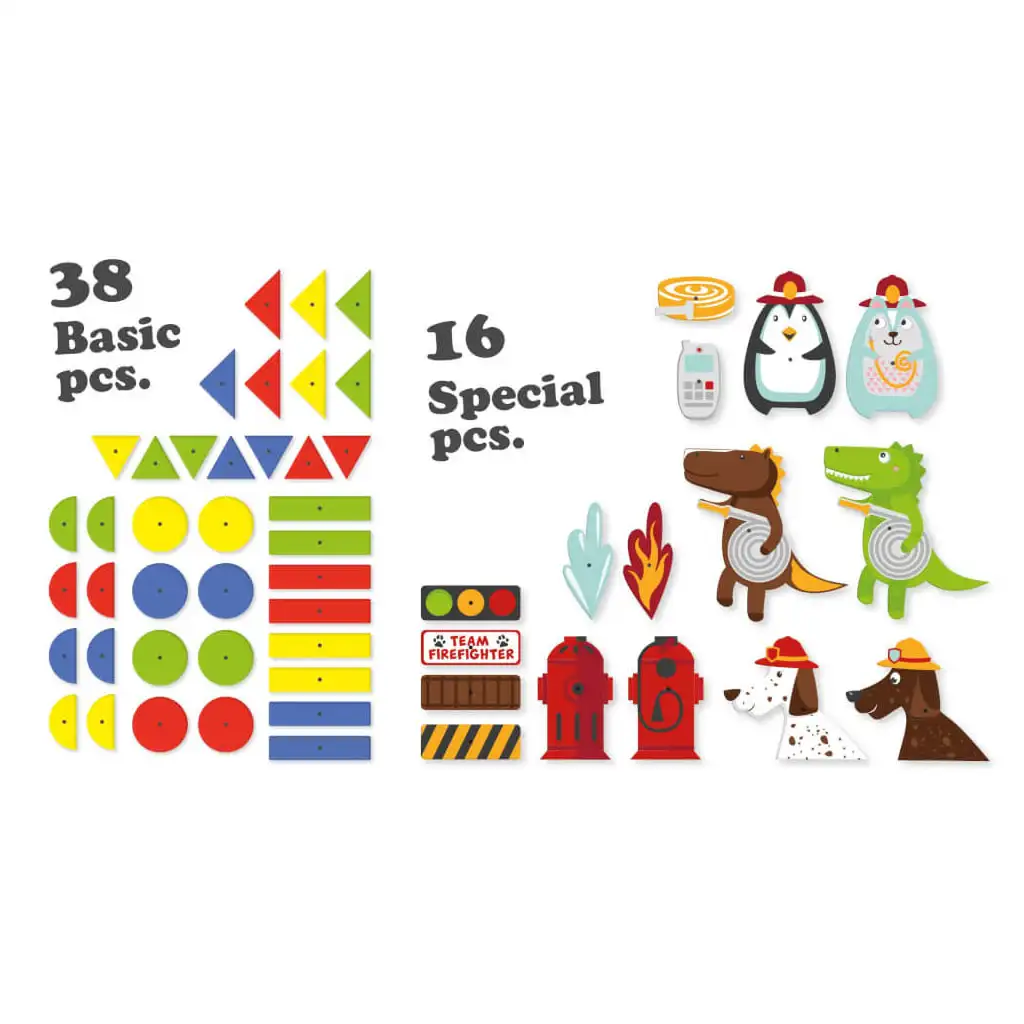 Ta garnitura z gasilsko tematiko omogoča otrokom, da ustvarijo življenjske in zabavne gasilske prizore. Oblike in orodja v kompletu pomagajo malčkom razvijati njihovo spretnost in kreativnost, hkrati pa nudijo zabavno igro.