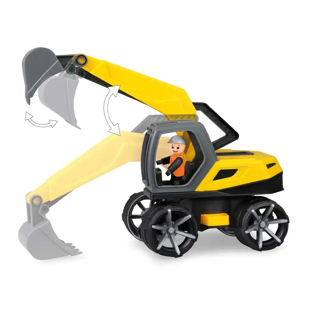 Kabina je v celoti prilagojena za igro, v njej pa LENA® figurica pomaga začeti veliko delo. Z gibljivo bager roko so zemeljska dela otroška igra, podvozje pa je mogoče zakleniti, zato stroj med igro ostane stabilen. 4 mm debela pocinkana jeklena os zagotavlja dolgo življenjsko dobo, s priključkom za prikolico pa lahko po potrebi priključite še več delovnih strojev.