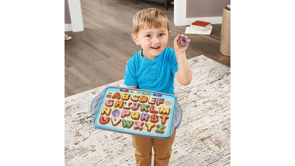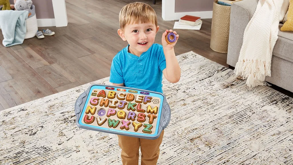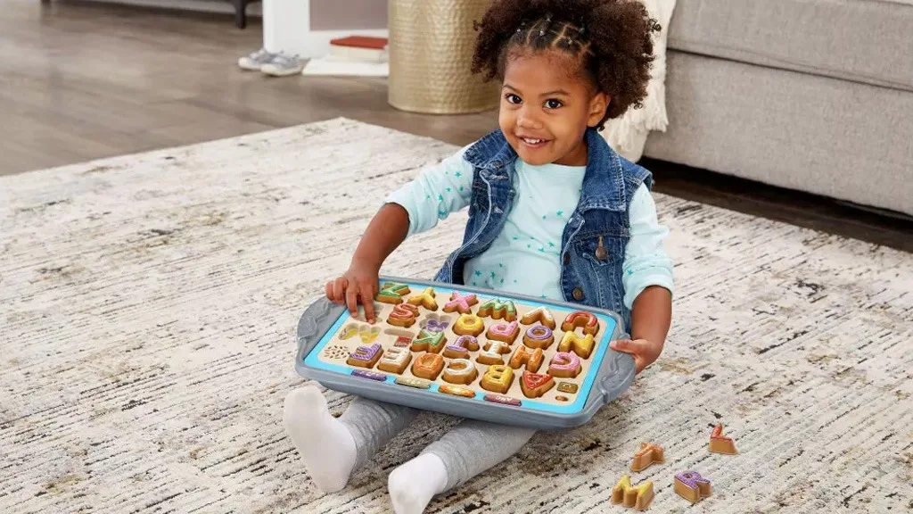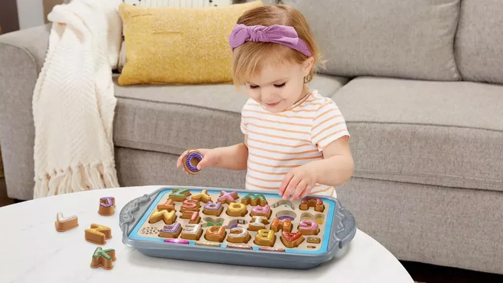 Čeprav je pladenj morda prevelik, da bi ga nosili v restavracijo ali čakalnico, lahko enostavno služi kot igra za v avto. Ko so enkrat piškoti varno nameščeni, so dovolj stabilni, da prenesejo tudi resno tresenje, ne da bi padli ven. Vendar ni načina za shranjevanje kosov, zato se prepričaj, da imaš določeno vrečko ali škatlo za umetne piškote, ko niso na pladnju.Čeprav je igra oglaševana za otroke, stare 2 leta in več, lahko tudi mlajši otroci imajo koristi od igralnega časa z Match and Learn Cookies. Morda še ne razumejo, kaj pomenijo ali pravijo posnetki, vendar lahko vadijo postavljanje predmetov v pravilne izreze, se ukvarjajo z glasbo in prepoznavajo ujemajoče se barve. Ko postavljajo piškote na pladenj, lahko malčki uporabljajo svoje rastoče spretnosti fine motorike za pritiskanje piškotov in poslušanje naslednjih zvokov.Če ti glasba in beseda "piškotek" postaneta preveč, lahko izbereš med tremi glasnostmi: tiho, glasno in še glasneje. Otroci lahko tiho sestavljajo črke, oblike in barve ali pa si izmislijo lastne igre in preberejo vsako črko brez pomoči zvoka. Preizkusi sebe in svojega otroka tako, da ju prosiš, naj brez zvočnega vodnika na pladnju napišeta različne besede!Če vaš otrok ne mara preizkušati novih stvari, ga bodo morda te lažne bananine, jabolčne in kokosove piškote prepričale! Če niso preveč navdušeni nad učenjem novih stvari, je to tudi odličen način, da jih naučite različnih stvari, medtem ko se še vedno zabavajo.Mladi slaščičarji se lahko pretvarjajo, da pripravljajo in pečejo 26 okusno izgledajočih črkovnih piškotov. Pritisni na barvni piškot na pladnju, da slišiš imena črk, zvoke črk, barve in okuse. Zdaj si ti kuhar! Vzemi piškote s pladnja in postrezi sladke dobrote prijateljem in družini. Poslušaj pozorno, da slišiš, kateri piškot moraš speči...