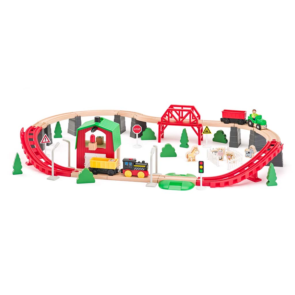 Lesena kmetijska železniška proga z vlakom in dodatki, 60-delni komplet - Woodyland