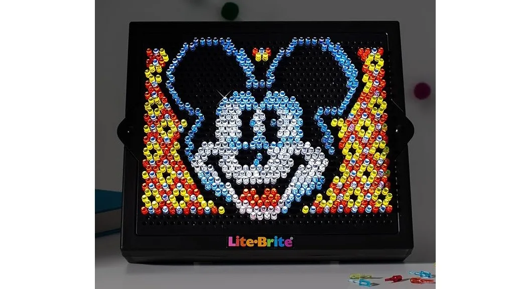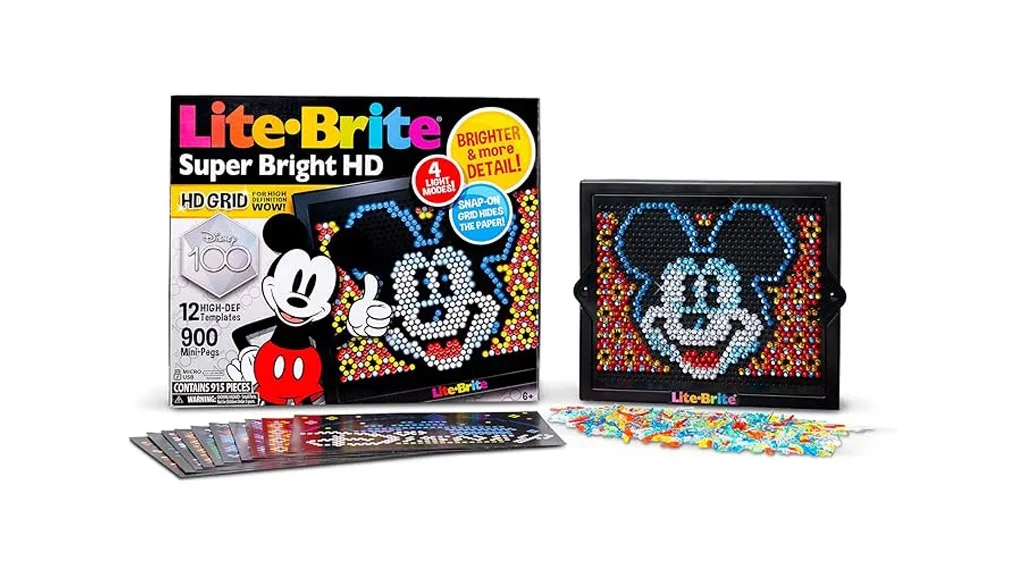Lite-Brite Super Bright HD Disney100 je na voljo na spodnjih povezavah!Ta komplet Disney tematskega Lite-Brite ima visokoločljivostni zaslon in najnovejšo LED tehnologijo, ki zagotavlja živahnejše barve in jasnejše slike. Vključuje predloge z ikoničnimi Disneyjevimi liki, kot so Mickey Mouse, Donald Duck, Simba in še več. Otroci lahko preklapljajo med različnimi svetlobnimi načini, da popestrijo svoje stvaritve.