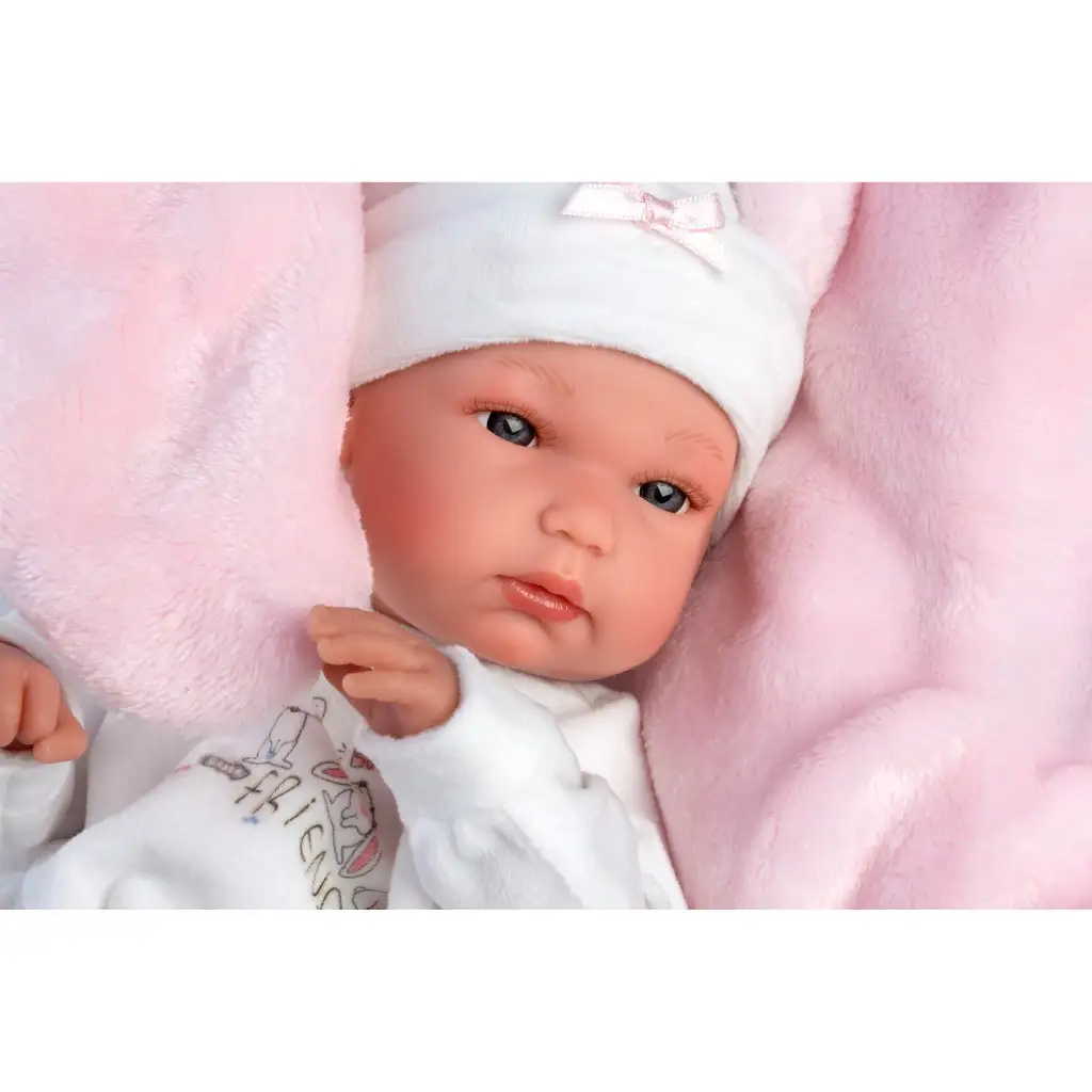 Spoznajte dojenčka Llorens Bimba, dolgega 35 cm, ki počiva na čarobnem roza zajčjem vzglavniku in čaka, da ga obdarite z ljubeznijo! Dojenčkova življenjska podoba in nežni detajli, kot so kapica okrašena z majhnim trakom in bodi z napisom "Best Friends", nudijo pristno srčno izkušnjo. Mehka roza blazina ne samo da služi udobju vašega dojenčka, ampak igro naredi še čarobnejšo s svojimi lahko prijemljivimi ušesi, ki pomagajo pri držanju dojenčka. Plastično telo je idealno za aktivno igro, enostavno se čisti in prenese veliko objemanja. Vsak španski dojenček Llorens je ročno izdelan z izjemno pozornostjo do detajlov in uporabo skrbno izbranih materialov, da zadosti najvišjim standardom kakovosti. Dojenček prispe v čudoviti okrasni škatli, zato je popolna izbira tako za otroke kot za zbiratelje.