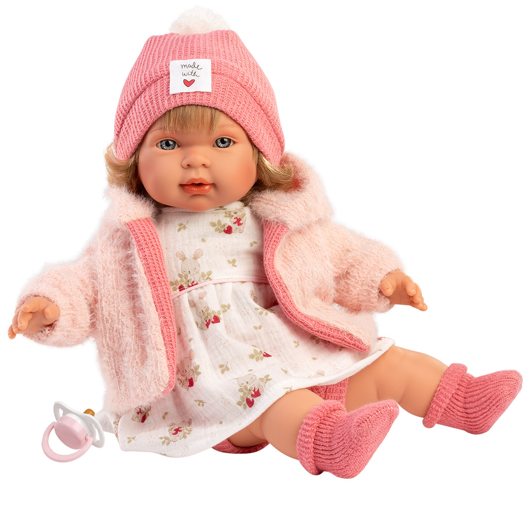 Llorens: Carla, 42 cm jočeča lutka z dudo v kapici s srčkiLlorens: Carla, 42 cm jočeča lutka z dudo v kapici s srčki