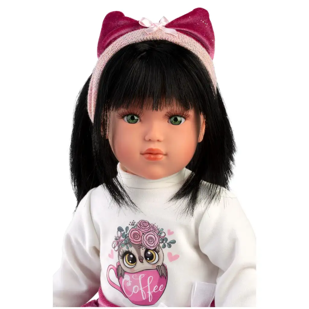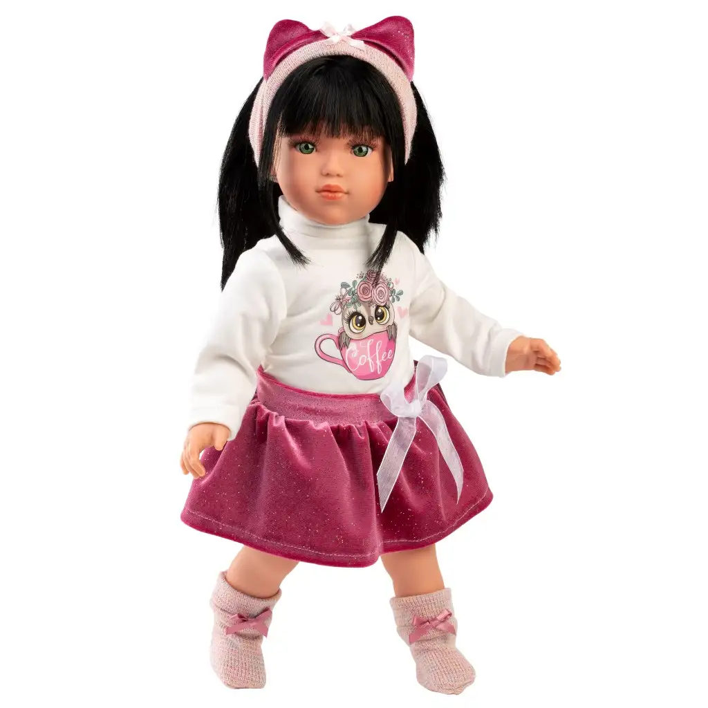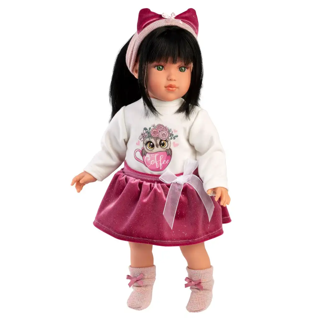 Srečajte Greto, 40 cm visoko lutko Llorens, ki bo s svojo očarljivo osebnostjo takoj osvojila srce vašega otroka! Greta ima življenjski videz in privlačne zelene oči, nosi pa tudi stilsko majico z motivom sove in bleščeče rožnato krilo, kar je vedno trendovska izbira v svetu lutk. Dodatki, kot so trak za lase in ljubke bleščeče čevlje, še dodatno poudarijo njen eleganten videz. Greta ima dolge, svilnate črne lase, ki so primerni za ustvarjanje različnih pričesk, tako da lahko otroci preživijo ure z ustvarjalnim in modnim urejanjem pričesk. Vsaka lutka Llorens je ročno izdelana s španskega premium razreda, izjemno podrobno obdelana in izdelana iz skrbno izbranih materialov, da zadosti najvišjim standardom kakovosti. Lutka prispe v čudoviti okrasni škatli, zato je odlična izbira tako za otroke kot za zbiratelje.