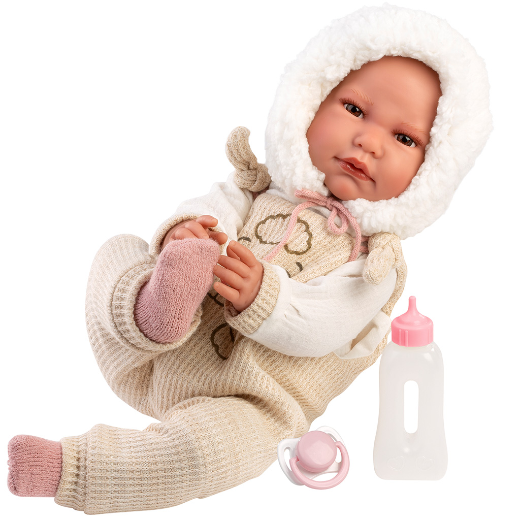 A Llorens: Luis, 45 cm jokajoča lutka, je popolna izbira, če iščeš resnično realistično in ljubko igračo za tvojega otroka. Lutka nosi mehak pajac v videzu pletenine, okrašen s prikupnim vzorcem jagnjeta, dopolnjuje pa jo topel puhast kapucar, zaradi katerega je njen videz še posebej prisrčen. Nežne pastelne barve in podrobna izdelava jo naredijo še bolj realistično. Z jokajočo funkcijo je lutko mogoče z dudico hitro pomiriti, tako tvoj otrok med igro doživi izkušnjo skrbi za lutko. Steklenička in duda ponujata dodatne možnosti za igro vlog.