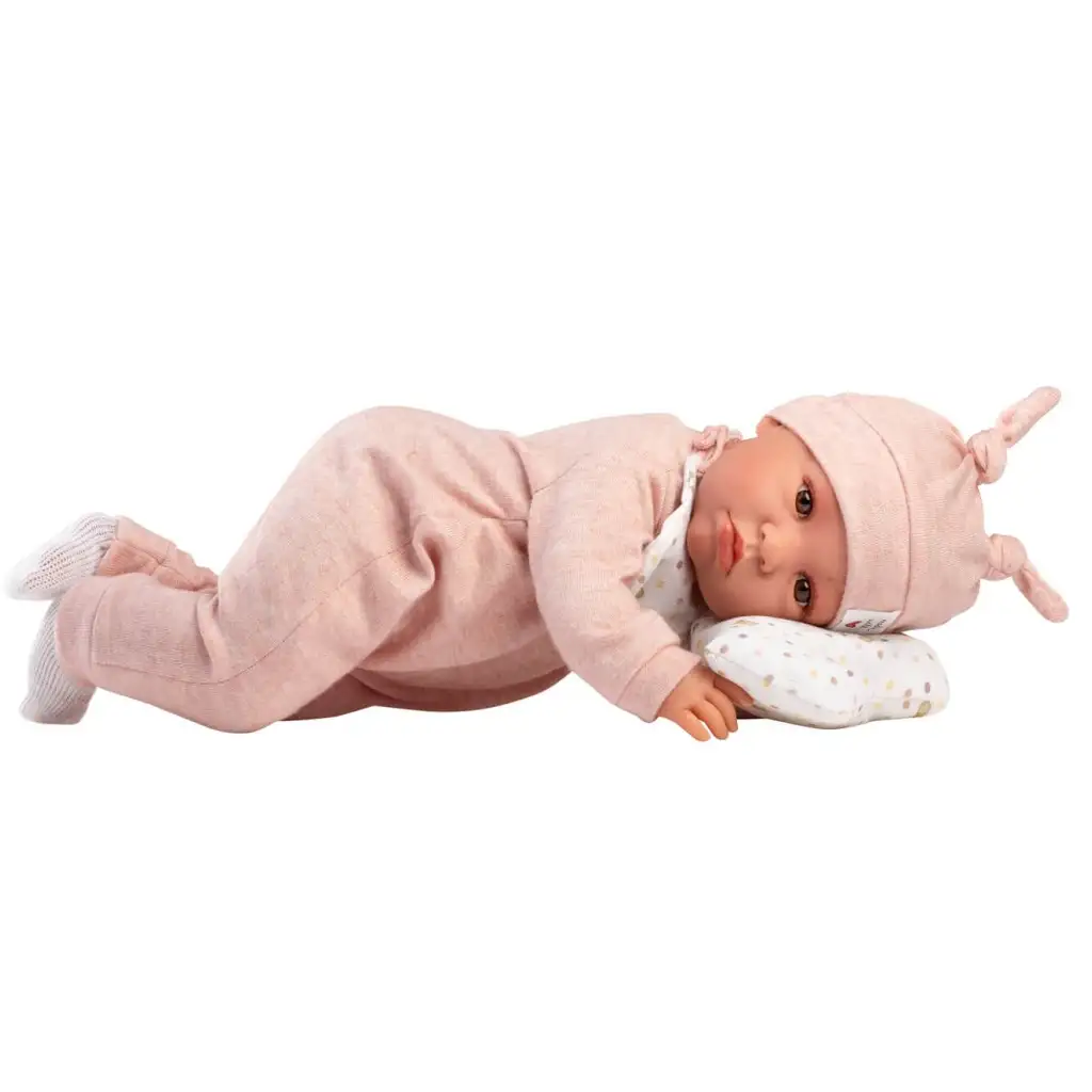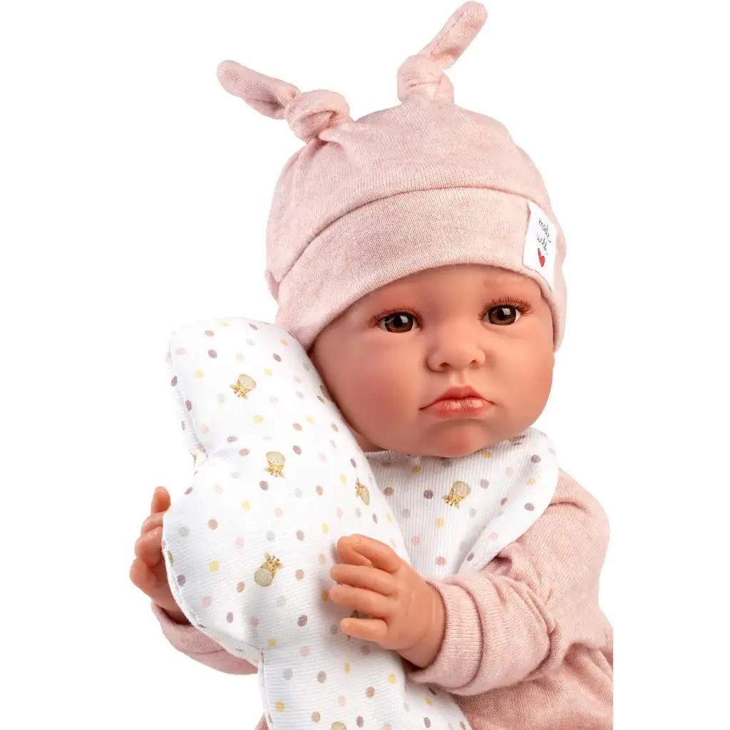 Punčka je oblečena v mehko, svetlo roza pajac, ki ga dopolnjuje prikupna kapa z zajčjimi ušesi, kar Luno naredi resnično posebno in igrivo. Okoli vratu nosi pikčasto slinček, v naročju pa drži barvno usklajeno blazino v obliki oblaka – ta blazina ni le dekorativna, ampak tudi praktičen dodatek za igro vlog. Majhen cof na blazini še dodatno polepša celoten videz.