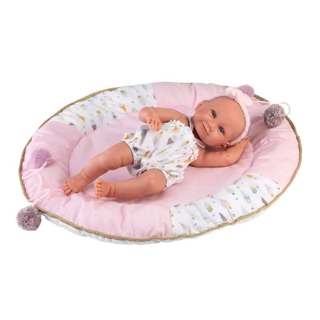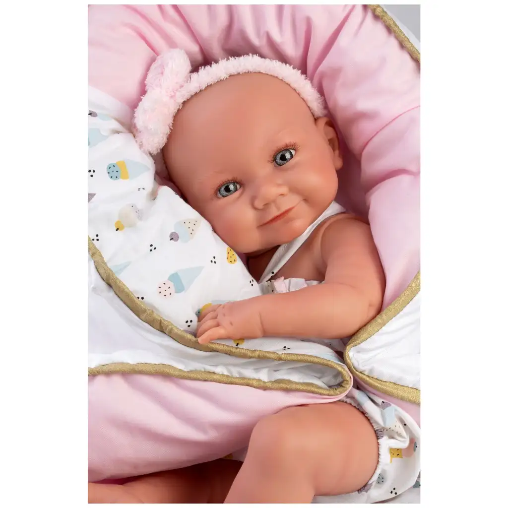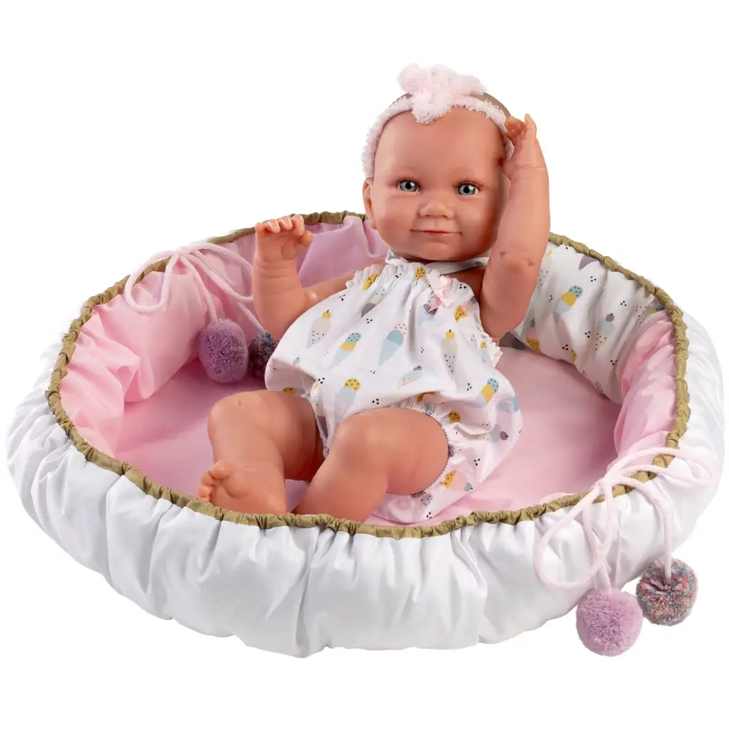 Llorens: Nica 40 cm novorojenček v oblačilih z vzorcem sladoleda z zibelko.