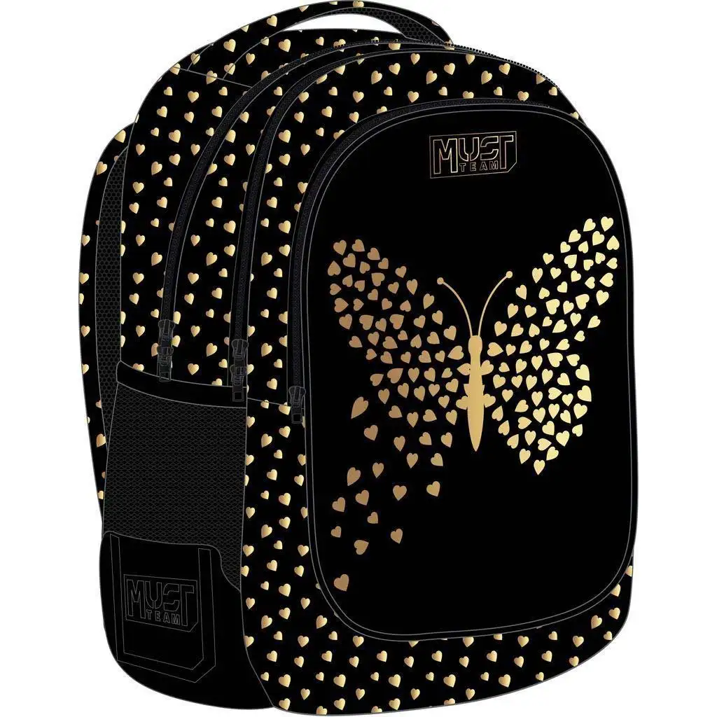 Stilna, unikatna in praktična – to je Luna: Must nahrbtnik z zaobljenimi 3 predali v različici z metulji, ki bo zagotovo najljubši vsaki modno ozaveščeni šolarki. Elegantno črno osnovo popestri čudovit metuljev vzorec iz zlatih srčkov, ki torbi daje moderen in poseben videz. Ni le lep, ampak tudi izjemno uporaben za vsakodnevno šolsko uporabo.