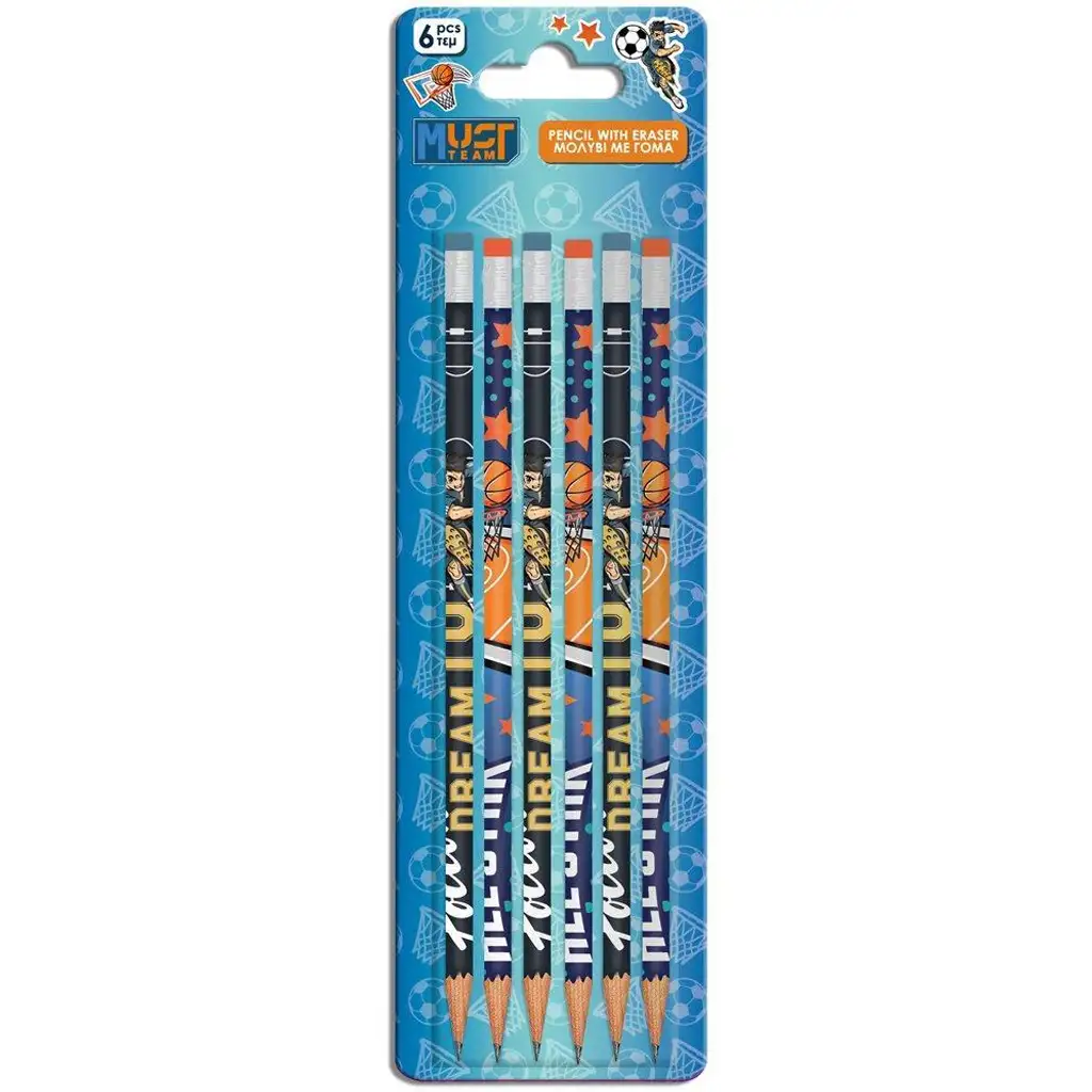6 grafitnih svinčnikov z radirko, z nogometnimi in košarkarskimi motivi
