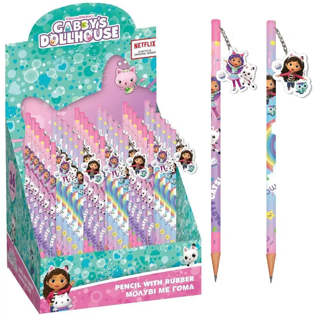 Na koncu svinčnika je na verižici obešana mini Gabi radirka, ki ni samo praktično orodje za popravljanje napak, ampak tudi prava majhna igračka. Barvit dizajn je poln mavric, zvezdic in motivov s mucami, ki zagotovo izvabijo nasmeh na obraze najmlajših med učenjem ali risanjem. Oblika svinčnika je udobna, enostavno ošiljiva in ravno prav debela za otroške roke, kar spodbuja pravilen oprijem svinčnika.