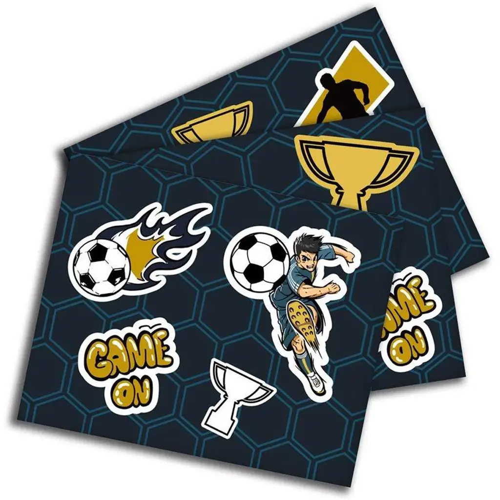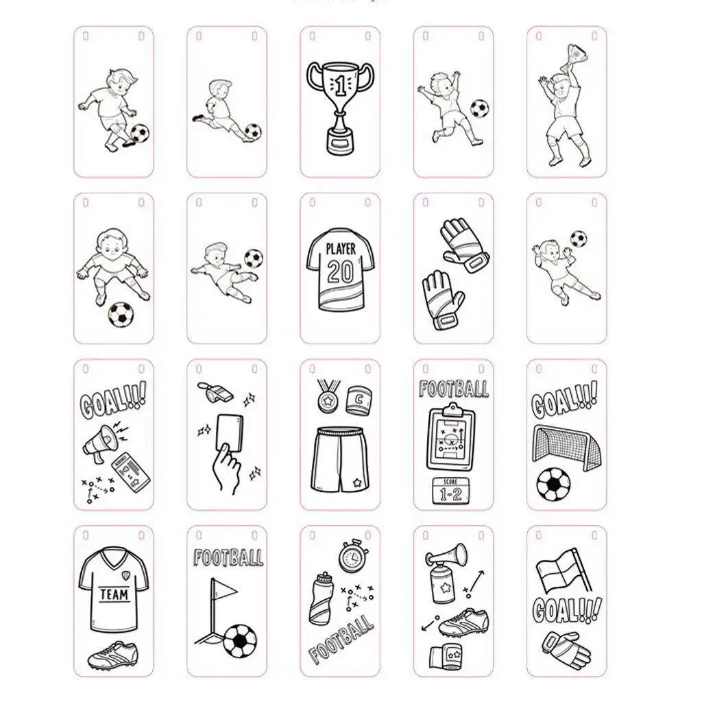 Set vsebuje 20 pobarvank s karticami, na katerih so različni nogometni prizori, igralci, elementi na igrišču, pokali in prizori z tekem – vse to čaka, da jih otroci pobarvajo po lastni domišljiji. Priloženi so 4 živi flomastri (modra, svetlo modra, zelena, rumena), ki so popolni za oživitev slik. Za še več zabave poskrbijo 3 lista nogometnih nalepk, na katerih so žoge, pokali, igralci in napisi »Game On«.