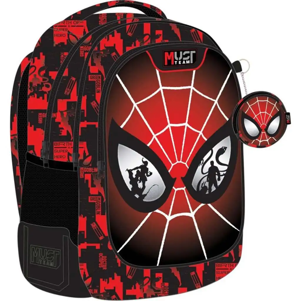 Ta zaobljen nahrbtnik s tremi predali s tematiko Spider-Mana je resnično odlična izbira za vse male ljubitelje superjunakov! Sprednjo stran nahrbtnika krasi ikonična Spider-Manova maska, v odsevu njegovih oči pa se pojavljajo zlobneži (na primer Green Goblin in Dr. Octopus) – s tem dizajnom bo zagotovo izstopal iz šolske množice. Rdeče-črna barvna kombinacija je dinamična in kul, mestno ozadje ter superjunaški elementi pa še dodatno popestrijo videz.