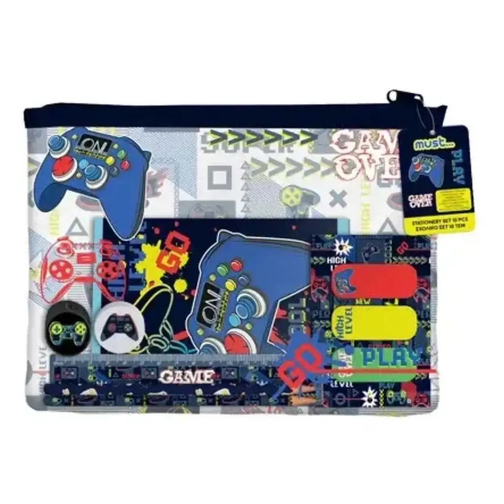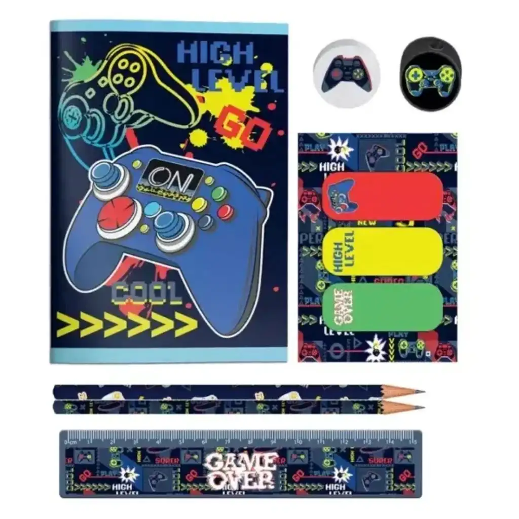V kompletu so mali zvezek, dve grafitni svinčniki, ravnilo, radirka, šilček in trije barvni knjižni zaznamki, vse skupaj pospravljeno v vzdržljivi, zadrgo zaprti torbici. Torbica zlahka gre v šolsko torbo, tako bodo vsa pomembna potrebščina vedno pri roki. Temna osnovna barva z neonskimi motivi in grafiko igralnega kontrolerja daje res kul videz – to bo preprosto oboževal!