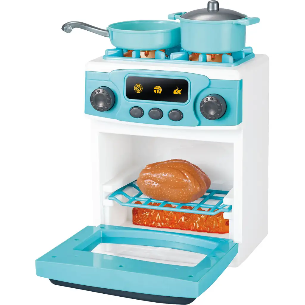 Komplet vsebuje plinski štedilnik z dvema gorilnikoma, pečico z vratci, ki se odpirajo in z lučko, poleg tega pa ponev, lonec in igračo pečeno piščančje meso – tako se igra lahko začne takoj! Vrtljivi gumbi klikatjo, notranjost pečice sveti, in s posodami, ki jih lahko postavimo na štedilnik, postane izkušnja kuhanja še bolj realistično. Med igro vlog otroci doživijo veselje kuhanja, hkrati pa razvijajo fino motoriko, ustvarjalnost in reševanje problemov.