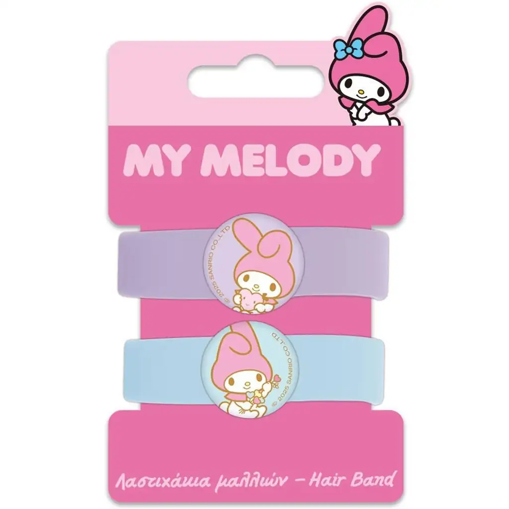 Komplet vsebuje eno pastelno vijolično in eno svetlo modro elastiko za lase, na katerih se v sredini nahaja reliefna figura My Melody. Na vijolični elastiki My Melody objema plišastega medvedka, na svetlo modri različici pa se nasmejano drži šopek rož – obe ustvarjata sproščeno, prijazno vzdušje. Zaradi prožnega in mehkega materiala, prijaznega do las, elastike ne vlečejo laseh, zato jih lahko otroci nosijo udobno ves dan.