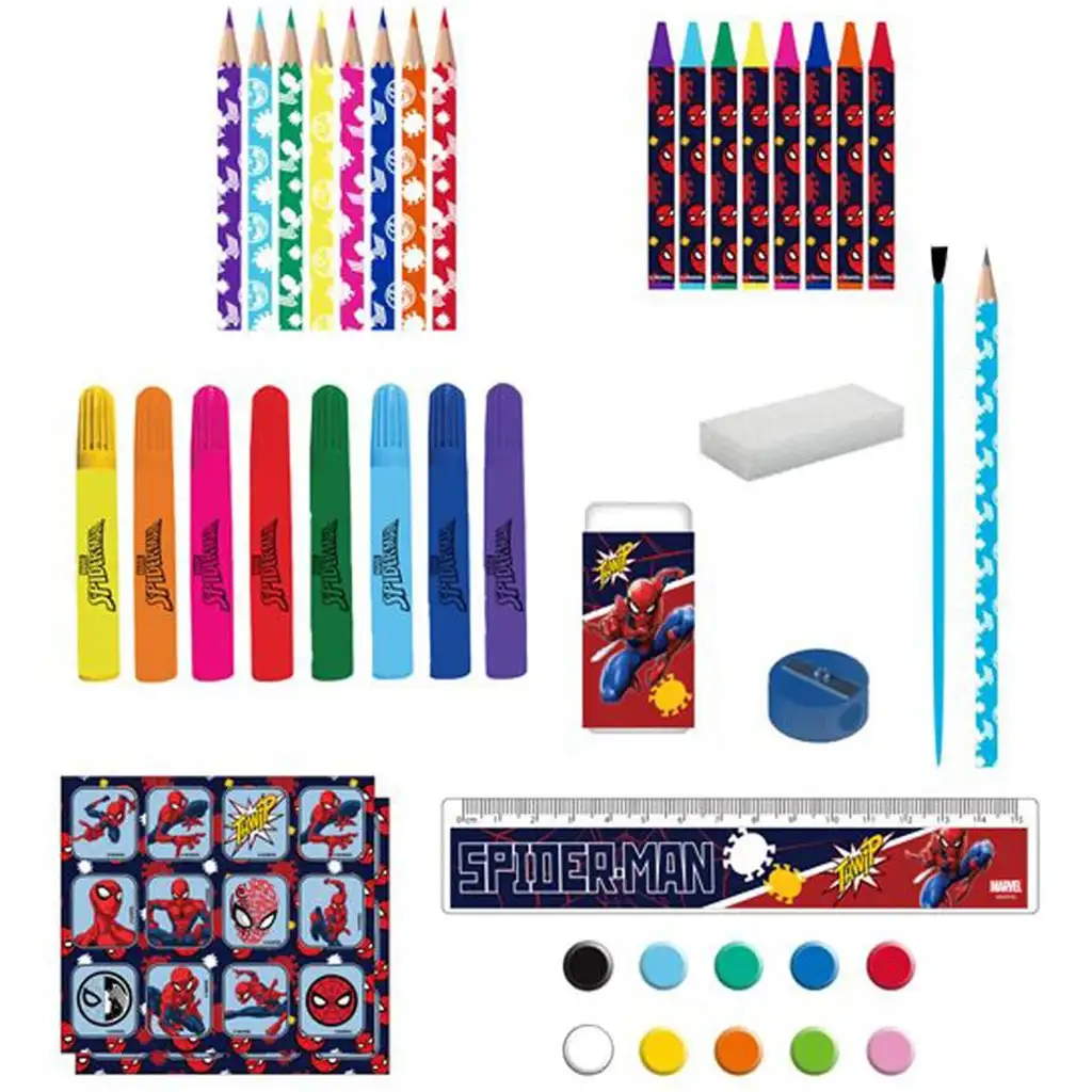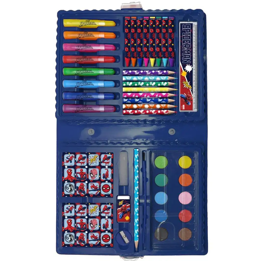 Sprostite otroško ustvarjalnost s tem superherojskim, 42-delnim ustvarjalnim kompletom Spider-Man! Če je vaš sin navdušen nad Marvelovim vesoljem in rad riše, barva ali slika, bo ta komplet prava izbira. V kompletu najdete vse, kar potrebujete za ustvarjanje: barvice, flomastre, voščenke, vodene barve, čopič, radirko, šilček in celo ravnilo – vse to v stilski embalaži z motivom Spider-Mana!