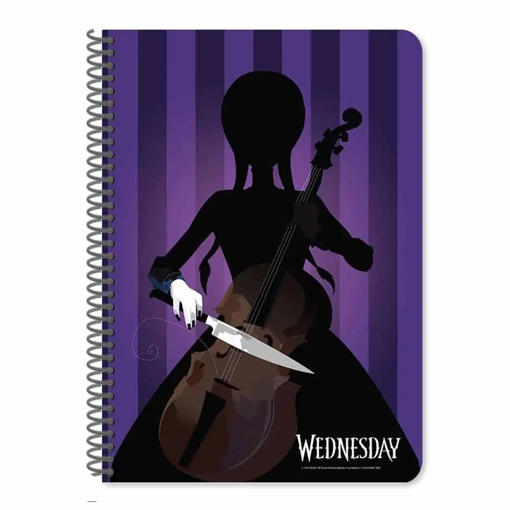 Očaraj beležke s to črtasto spiralno beležko Luna Wednesday! Beležka velikosti A4 s 60 stranmi je na voljo v dveh edinstvenih dizajnih, ki prikazujeta svet priljubljenega lika Wednesday Addams. Na eni platnici je Wednesday prikazana med igranjem violine, kjer namesto loka drži nož, na drugi platnici pa je prikazana njena prepoznavna silhueta s kitkami. Oba dizajna izžarevata temno in skrivnostno vzdušje, kar je popolna izbira za vse oboževalce družine Addams.