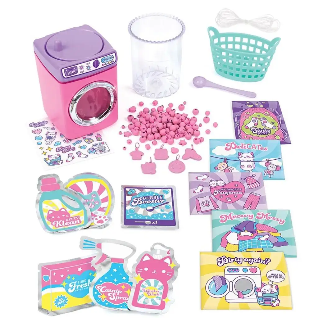 Perlice in obeski, ki jih najdete v kompletu, so na prvi pogled enobarvni, vendar potem, ko jih otroci položijo v mini pralni stroj in „operejo“, se postopoma razkrijejo čudovite barve! Nato se lahko začne izdelava zapestnic. S tem kompletom lahko izdelate kar 5 popolnih zapestnic, tako da so lahko odlična darila za prijatelje ali družinske člane.