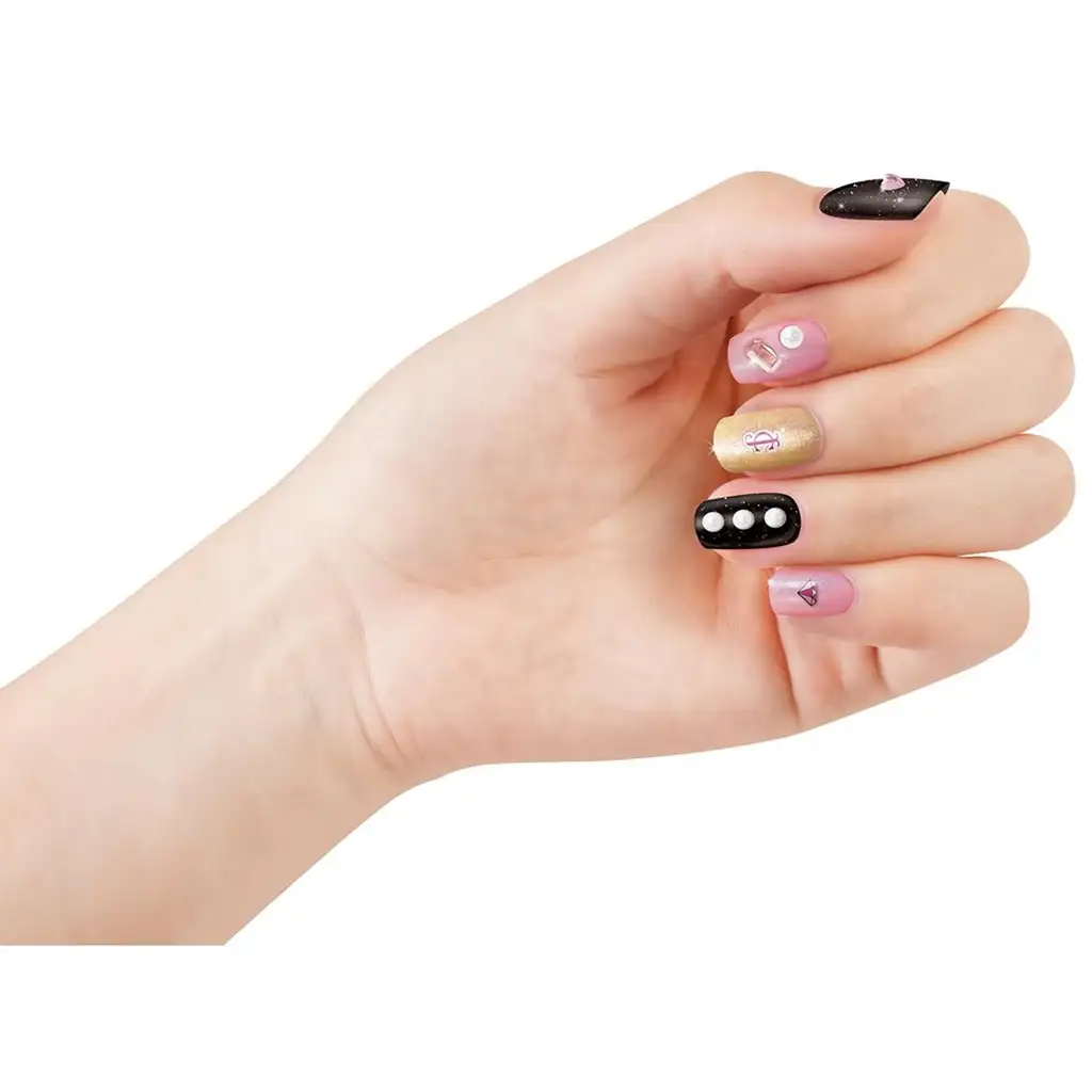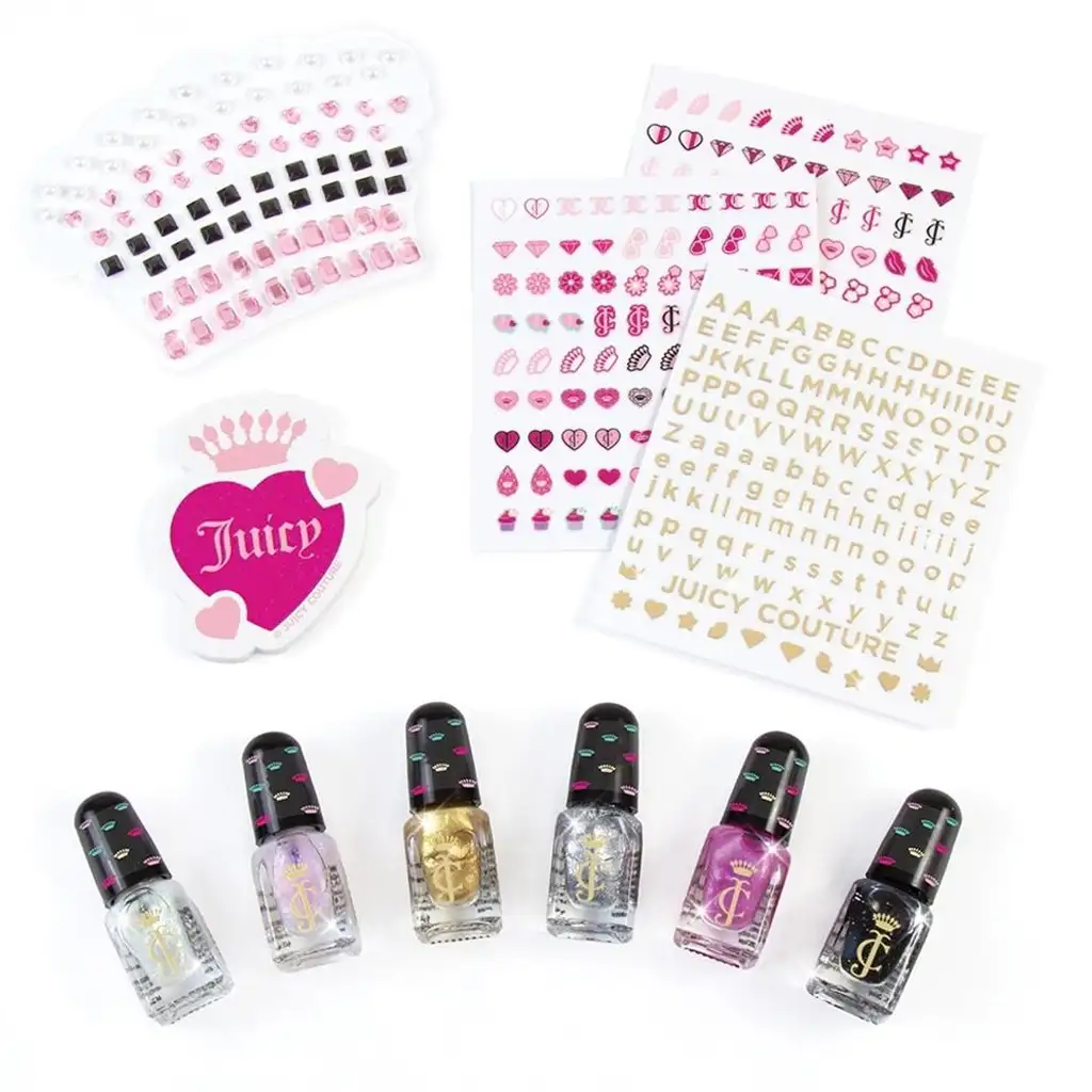 Set vsebuje 12 kosov, med njimi 6 bleščečih, kovinskih in temnih odtenkov mini lakov za nohte, tri liste nalepk, en list okrasja za nohte ter en list perlastih in črkovnih nalepk, s katerimi bo vsaka dekoracija nohtov popolnoma edinstvena in izrazna. Kombinacija Juicy Couture logotipov, ikoničnih motivov in bisernega sijaja bo zagotovo navdušila dekleta.
