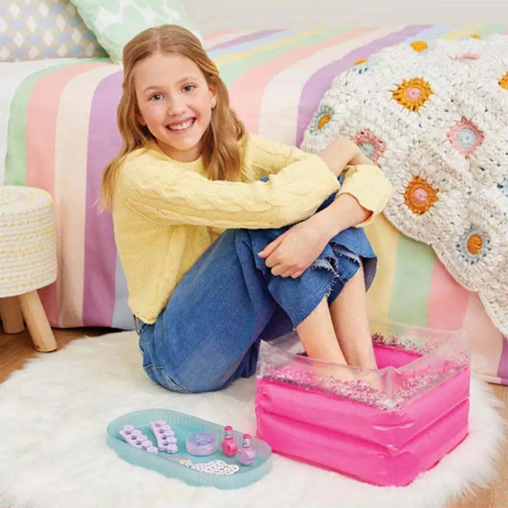 Potopite se v svet sprostitve in nege z igračo Make It Real spa! Ta paket vsebuje vse, kar potrebujete za izvedbo pravega dneva wellnessa za nego nog doma. Osrednji del kompleta je napihljiva wellness kad za noge, v kateri lahko razvajate utrujene noge v prijetni, topli kopeli. Kad ni samo praktična, ampak tudi zelo stilsko in prijetno. Kot nujni del nege nog, paket vsebuje dva različna odtenka laka za nohte, da lahko vašim prstom daste sijočo lepo barvo. Za natančno lakiranje sta na voljo dva ločevalca za prste, tako da med nanosom ne bo madežev. S pomočjo nalepk za nohte lahko nadaljujete s kreativnostjo in edinstvenostjo, s katerimi lahko vaši nohti dobijo res posebno dekoracijo. Za popoln rezultat uporabite pilico za nohte, da lahko obliko nohtov natančno oblikujete.