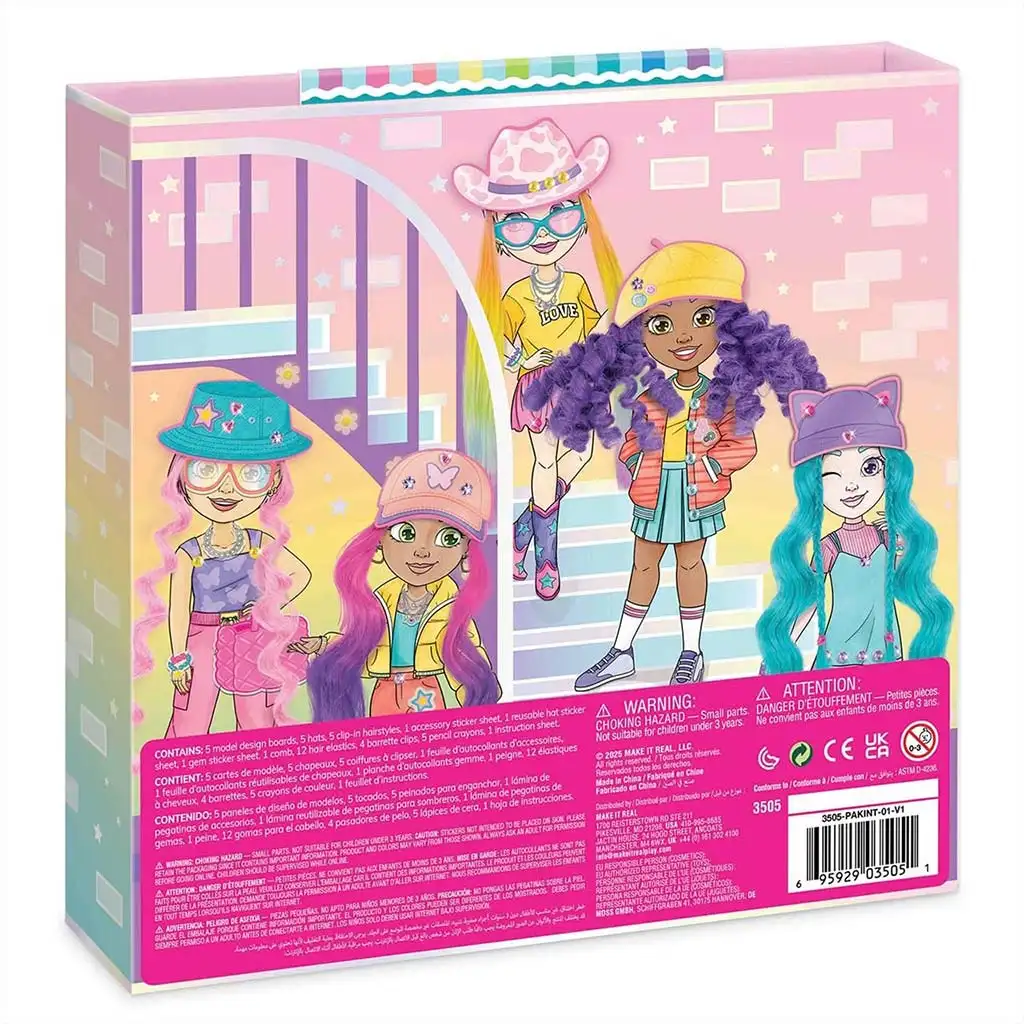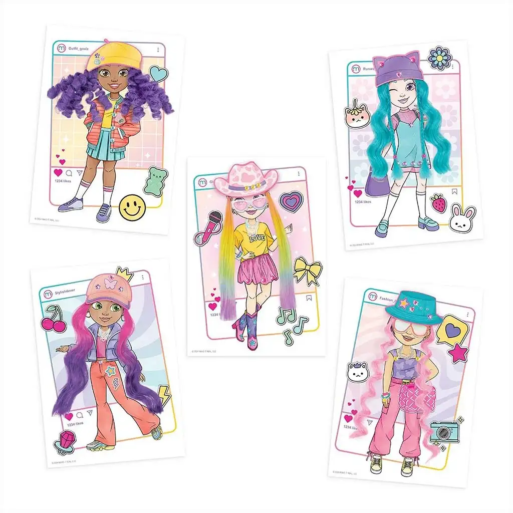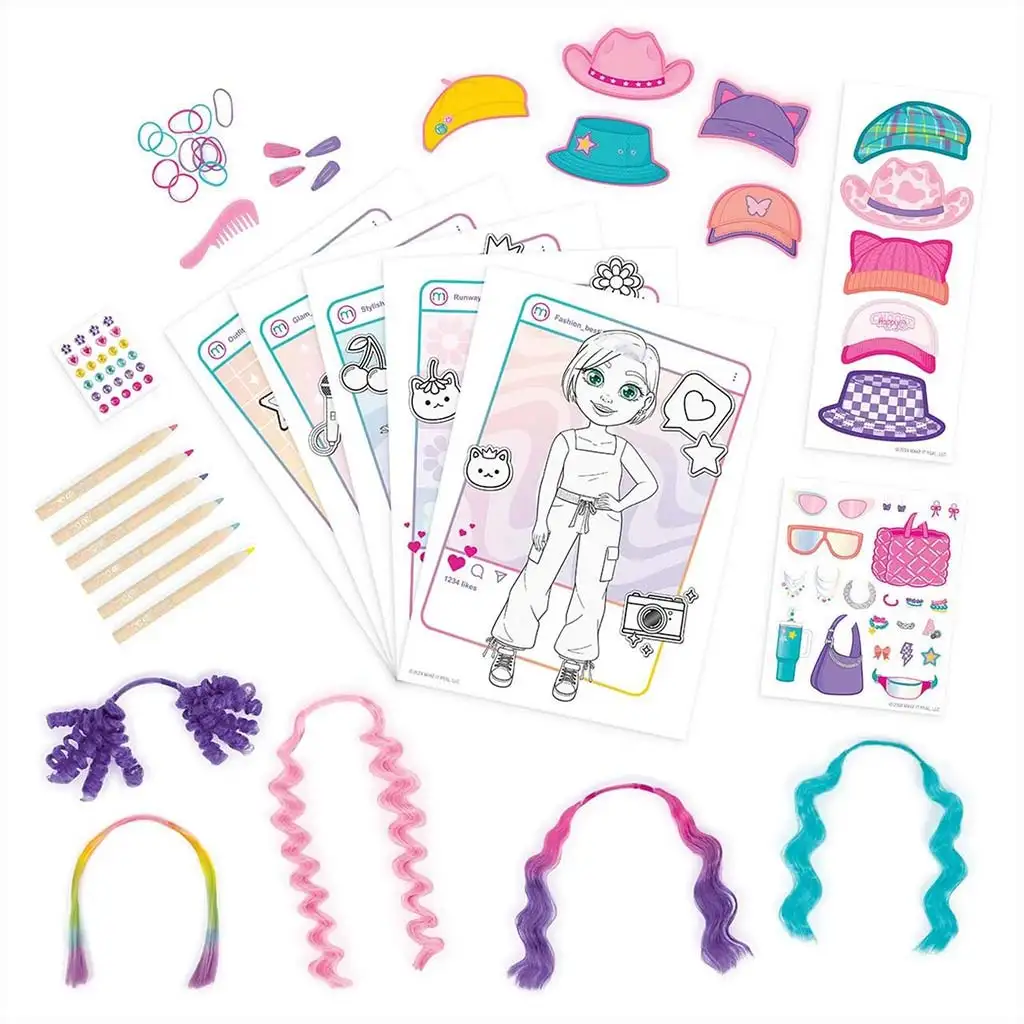 Komplet vsebuje 5 različnih modelnih podlag, ki jih je mogoče oblikovati s priloženimi barvnimi svinčniki, nalepkami in dodatki. Posebno doživetje ponujajo zamenljive barvne lasne pramene, ki jih je mogoče pritrditi na like in tako preizkusiti popolnoma nove pričeske. S pomočjo klobukov, sončnih očal, torbic in drugih modnih dodatkov je vsaka kreacija lahko unikatna – od športnega, boemskega do celo ekstravagantnega sloga.