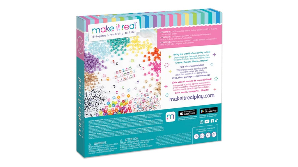 Komplet vsebuje samo kroglice in vrvico, zato boste potrebovali škarje, da vrvico odrežete na ustrezno dolžino. Za podrobna navodila in projektne ideje obiščite spletno stran Make It Real ali prenesite njihovo brezplačno aplikacijo iz trgovine Google Play ali Apple App Store.
