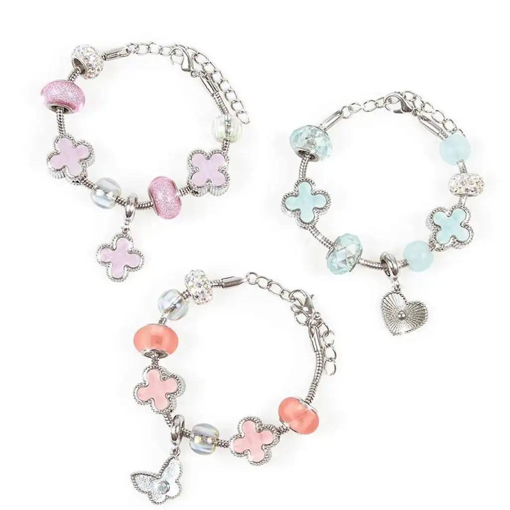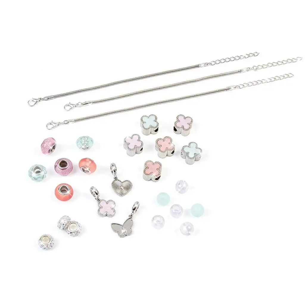 Komplet vsebuje bleščeče obeske, perle različnih barv in oblik ter tri verižice, ki jih lahko med seboj poljubno kombinirate. Rožnate, svetlomodre in prozorne pastelne barve dajejo končnim zapestnicam prefinjeno eleganco, medtem ko obeski v obliki srca in metulja poskrbijo za igriv in oseben pridih. V kompletu je vse, kar potrebuje mali ustvarjalni oblikovalec – potrebna je le ščepec domišljije.