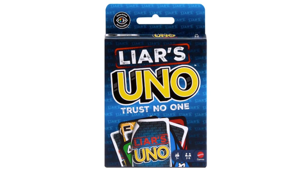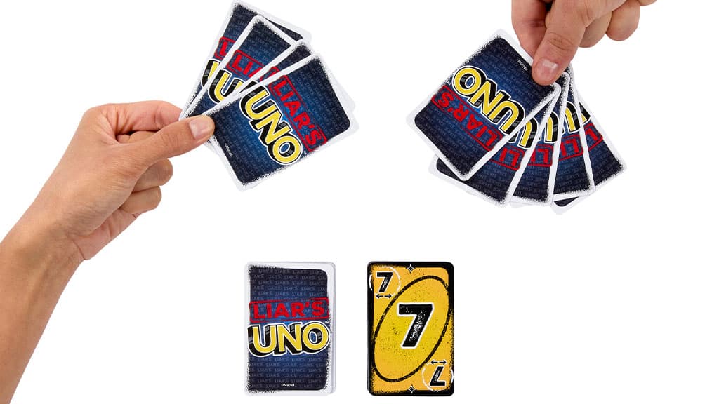 V igri Mattel UNO laž ni goljufija, temveč del igre! V tej izdaji UNO lahko tekmuje 2–6 igralcev, starejših od 7 let, da ugotovijo, kdo govori resnico in kdo blefira. Vsaki običajni oštevilčeni karti pripada tudi karta Liar, ki jo prepoznate po črni osnovni barvi. Karto Liar je treba odigrati obrnjeno navzdol, igralec, ki vleče, pa mora samozavestno povedati številko karte. Če ga ujamejo pri laži, mora potegniti novo karto. Če pa je govoril resnico, mora karto potegniti tisti, ki ga je obtožil. Igralci poskušajo z zavajanjem priti do zmage, vendar ostaja eno večno pravilo: ko ima nekdo v roki le še eno karto, mora zaklicati: UNO!