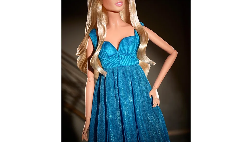 Lutka prikliče ikonični trenutek na modni stezi Claudie Schiffer iz jesensko/zimske modne revije Atelier Versace leta 1994. Obleka v morsko modri barvi, ki sega do tal, ustvarja eterealni občutek in nežen lesk z vsakega zornega kota. Videz je popolnoma dopolnjen z ujemajočimi se visokimi petami, njenimi znamenitimi blond prameni in nežnim ličenjem.
