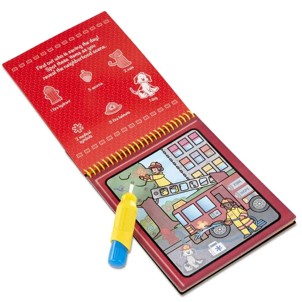 Paket vsebuje pisalo, ki ga lahko napolnite z vodo, ter 4 namenoma spiralno vezane plošče za ponovno uporabo, ki skrivajo barvite slike in podrobnosti za odkrivanje. Otroci morajo pisalo enostavno napolniti z vodo in medtem ko »barvajo« strani, se postopoma prikažejo skrita vozila, gradbišča, gasilci, vlaki in še veliko več. Ko se stran posuši, slika izgine, kar omogoča, da se igra prične znova – tako zagotavlja dolgotrajno zabavo na poti ali doma.