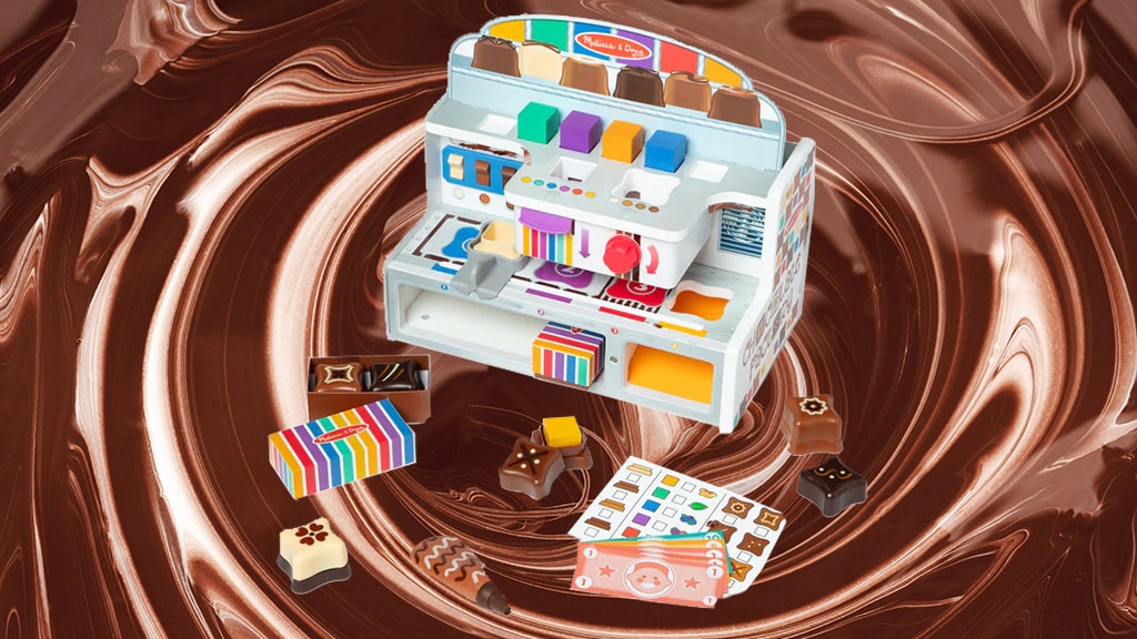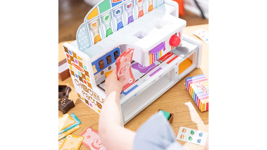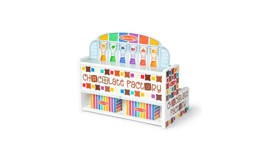 Melissa & Doug tovarna čokolade spodbuja otroke k domišljijski igri s pomočjo tovarne sladkarij in trgovine s sladkarijami. Otroci lahko mešajo in kombinirajo plastične lupine sladkarij, prelive in nadeve s pomočjo drsnega transportnega traku, stikal, ročic in gumbov, da sladkarije pridejo na svoje mesto. Set vsebuje šest osnov, pokrovov, barvnih kock, dve darilni škatli, cevi, table, kartico z dejavnostmi in igralni denar. Otroci lahko izdelujejo svoje sladkarije, izpolnjujejo in obdelujejo naročila. Ta igra ni le zabavna, ampak tudi razvija ustvarjalnost in fine motorične spretnosti, medtem ko se otroci učijo kombinirati barve in oblike ter osnove poslovnega razmišljanja. Med igro otroci doživljajo tudi veselje timskega dela, ko skupaj izdelujejo sladkarije in izpolnjujejo naročila.