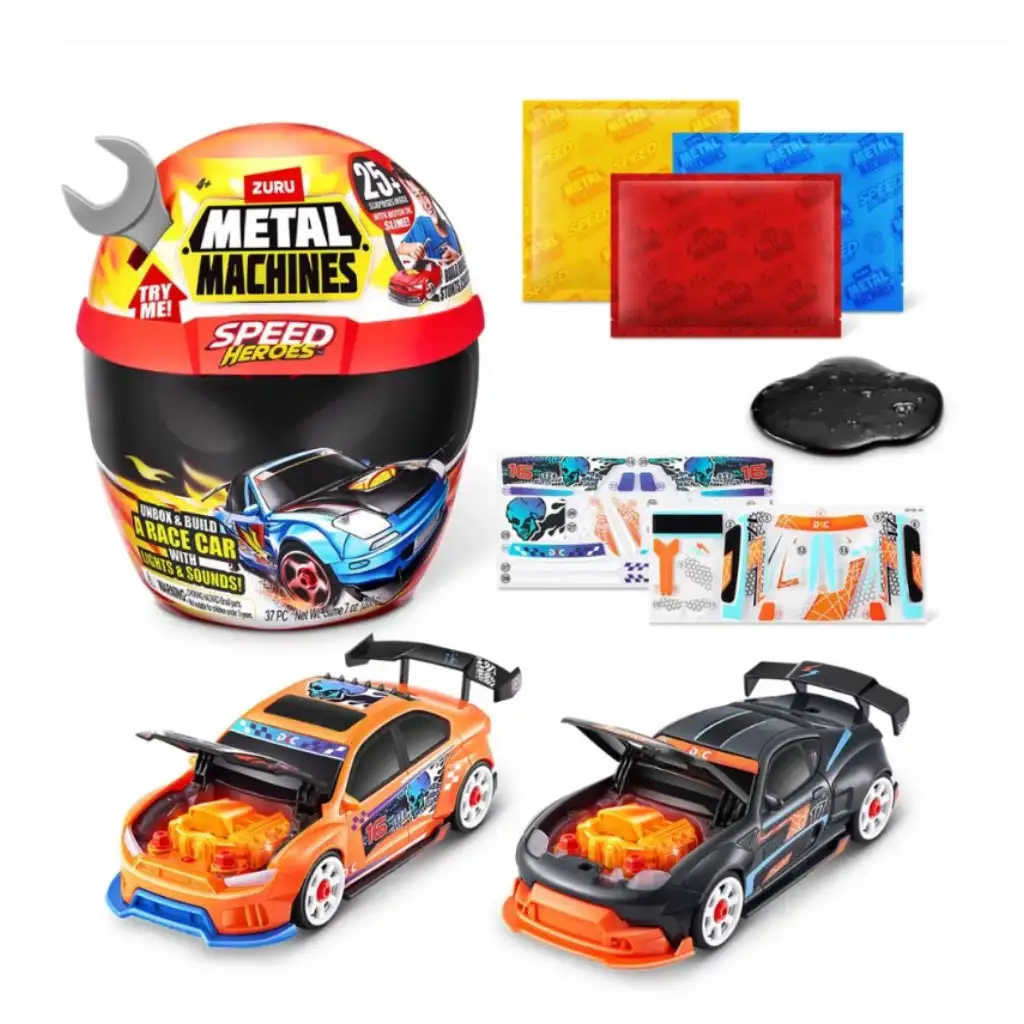 Razbij posebno kapsulo v obliki čelade in sestavljanje se lahko začne! Presenečenjski set Metal Machines Speed Heroes skriva več kot 20 vznemirljivih delov, s katerimi lahko sestaviš svoj dirkalni avto in ga popolnoma prilagodiš svojemu edinstvenemu slogu.