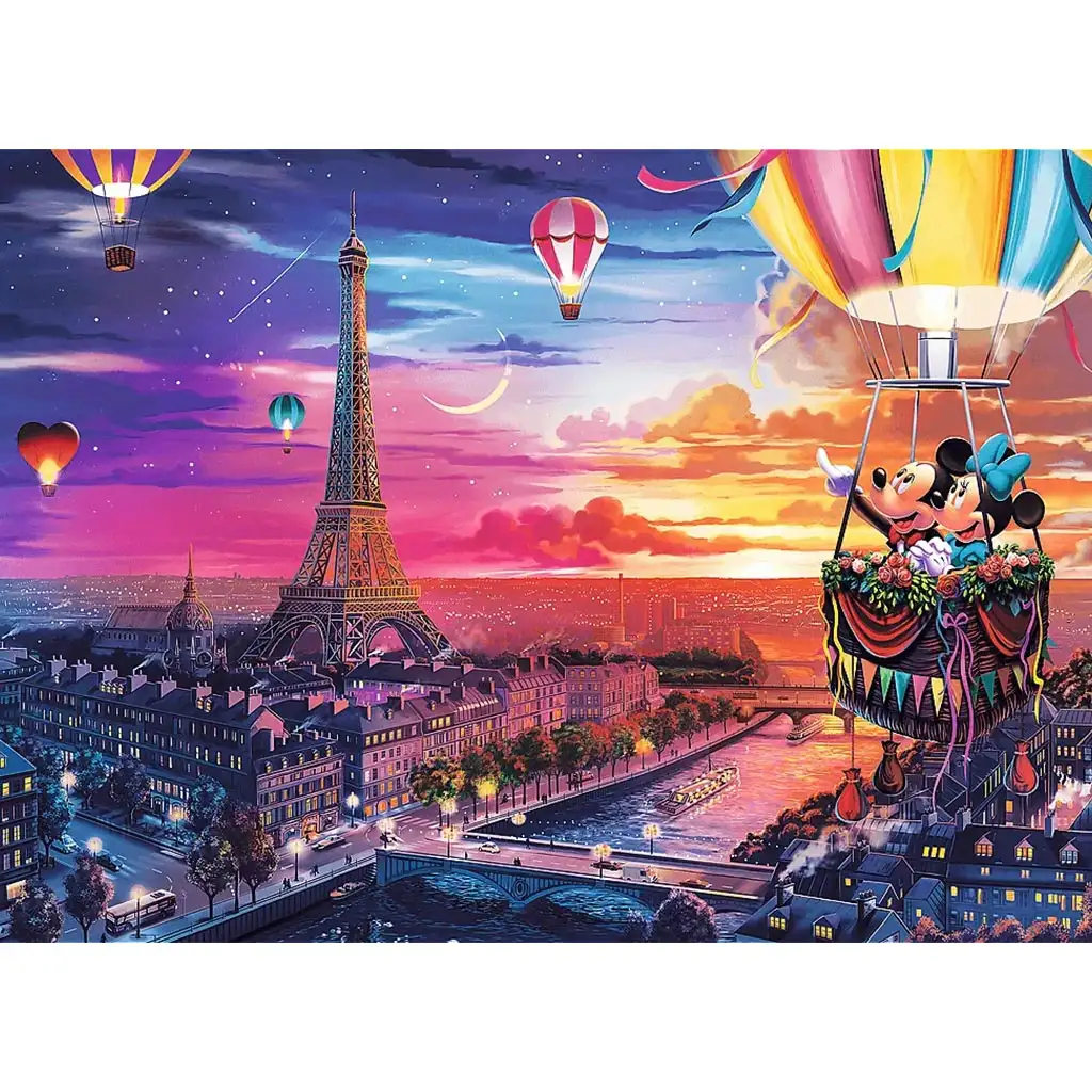 Dovoli, da te Mickey in Minnie popeljeta v mesto romantike s to sanjsko, 1000-delno sestavljanko! Puzzle »Disney – Mickey in Minnie v Parizu« prikazuje čarobni večer v mestu luči: par v balonu prečka nebo v soju zahajajočega sonca, medtem ko pod njima žarijo veličastne pariške stavbe ob Seni, vključno z Eifflovim stolpom. Barve slike so tople, domačne, polne balonov, zvezd in pravljičnega vzdušja.