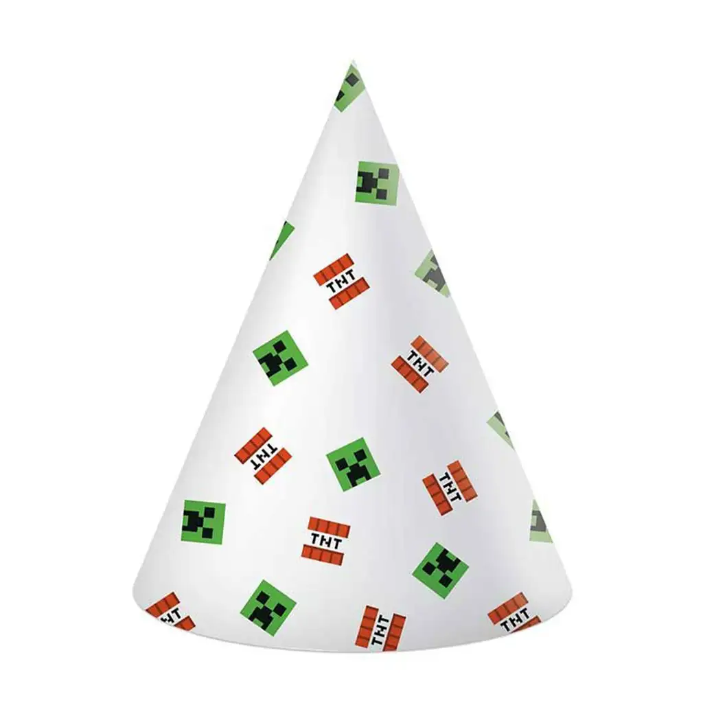 Če želite resnično posebne in nepozabne rojstnodnevne zabave za otroke, je komplet Minecraft party klobukov s 6 kosi popolna izbira! Ti pisani, veseli klobuki prikličejo svet ene najbolj znanih videoiger, Minecraft, in zagotovo bodo nasmejali vsakega malega oboževalca. Klasični stožčasti klobuki so okrašeni z živahnimi zelenimi obrazi Creeperjev in ikoničnimi TNT bloki na belem ozadju, zato je že od daleč jasno, da ste prišli na pravo Minecraft zabavo!