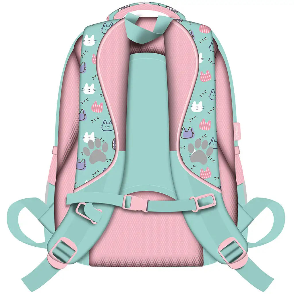 My Little Friend Fluffy Kitty mačji šolski nahrbtnik, nahrbtnik BPL58 44x31x19 cm je popolna izbira za vse šolarje, ki obožujejo mačke, saj združuje vesel, prijazen dizajn in praktične rešitve. Glavni motiv nahrbtnika je fotografija prikupnega mucka, ki ga dopolnjujejo srčki, zvezdice in igrivi grafični elementi. Roza in mentol-zeleno barvna kombinacija ter ljubki zadrge z motivom tačk naredijo ta model res posebnega, kar bo zagotovo navdušilo vašega otroka.