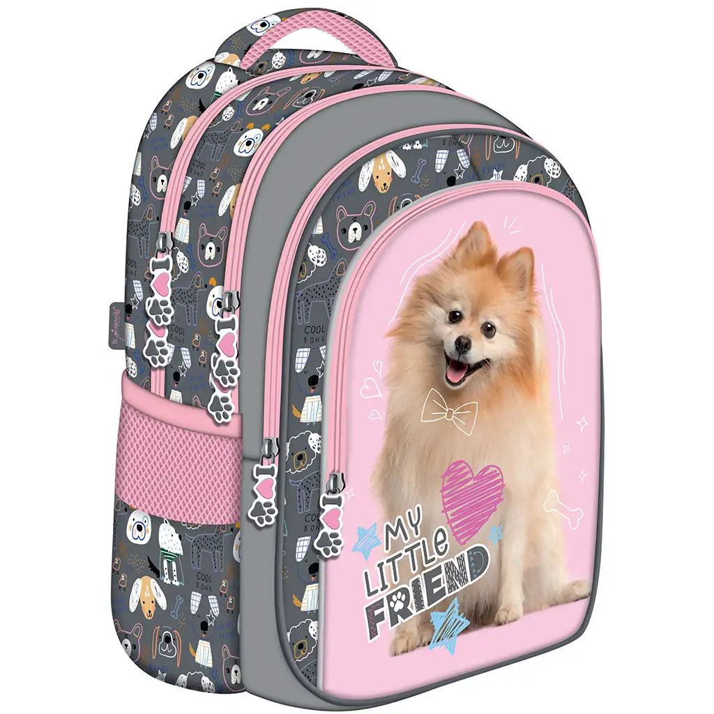 Šolska torba/nahrbtnik My Little Friend Sweet Pomeranian BPL58 v dimenzijah 40x29x19 cm je popolna izbira za vsakega osnovnošolca, ki obožuje pse. Dizajn nahrbtnika krasi prikupen nasmejan kužek pasme pomeranski špic, ki ga dopolnjujejo vesele srčke in zvezdice na rožnati in sivi podlagi. Stranski in naramni deli torbe so okrašeni s pisanimi motivi kužkov, kar nahrbtniku daje res prijazen in vesel videz.