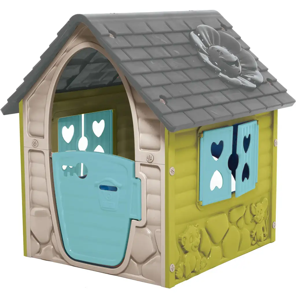 Hiška je prijazno in veselo oblikovana: ima polvisoka vrata z odpiranjem in kljuko, okna s polkni v obliki srčka ter okrašeno streho, na kateri se nahaja nasmejan cvet. Na stranskih stenah so reliefni okraski z ljubkimi živalicami, kar igro še bolj popestri in naredi hiško privlačno. Masivna, vremensko odporna plastična konstrukcija je varna in trpežna, zato jo brez skrbi postavite na vrt, kjer lahko stoji celo leto.