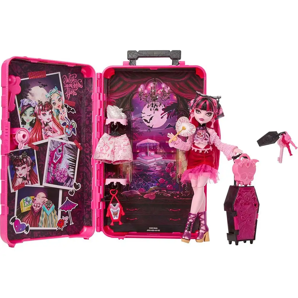 Draculaura je v tem setu pripravljena na potovanje in hkrati očarljivo grozljiva. Obleka v rožnato-črnih odtenkih, podrobno izdelani čevlji in značilna ličila se popolnoma ujemajo s svetom Monster High. Spete lase in obrazne poteze lutke so še posebej podrobno izdelane, zato je igra vlog še bolj pristna. Notranjost kovčka ni le prostor za shranjevanje, ampak se spremeni tudi v prijetno, »strašno lepo« prizorišče, ki spodbuja pripovedovanje zgodb in domišljijsko igro.