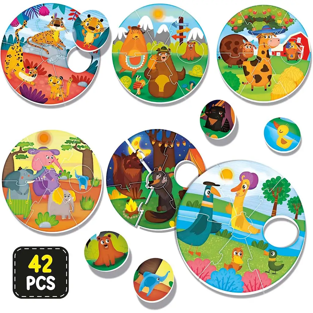 Med igro otroci spoznavajo odnose med živalmi, prepoznavajo oblike in izboljšujejo koordinacijo oko-roka. S 42 sestavljankami igra pritegne pozornost za daljši čas, ob tem pa nudi tudi občutek uspeha. Posebnost kompleta je, da ima vsaka sestavljanka okrogel kos, ki ga je treba prilegati ustreznemu živalskemu mladičku, zato je povezovanje še bolj zanimivo, prav tako kot ustvarjanje zgodb.