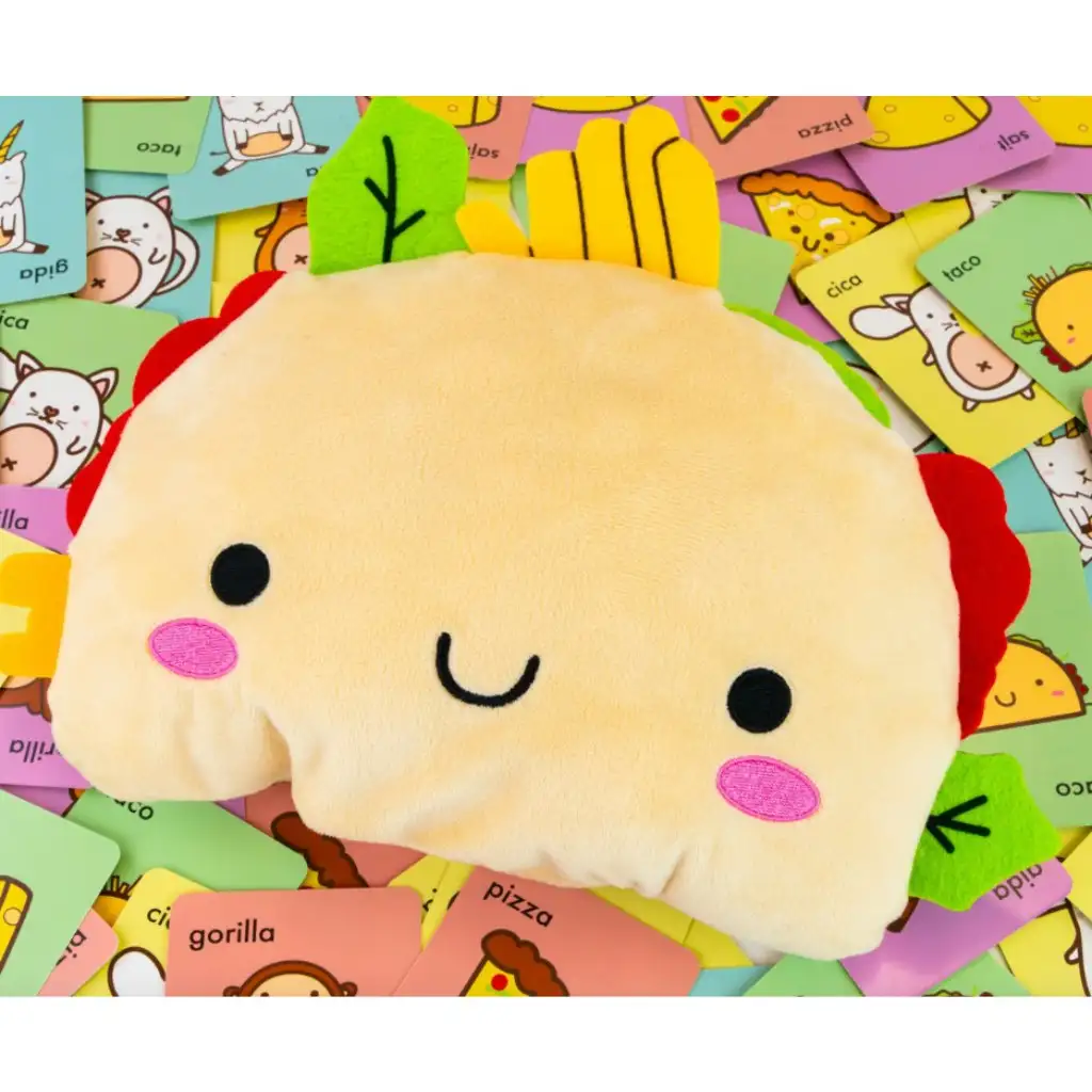 Vsebina škatle: komplet kart, plišasta figura tacos, pravila igre