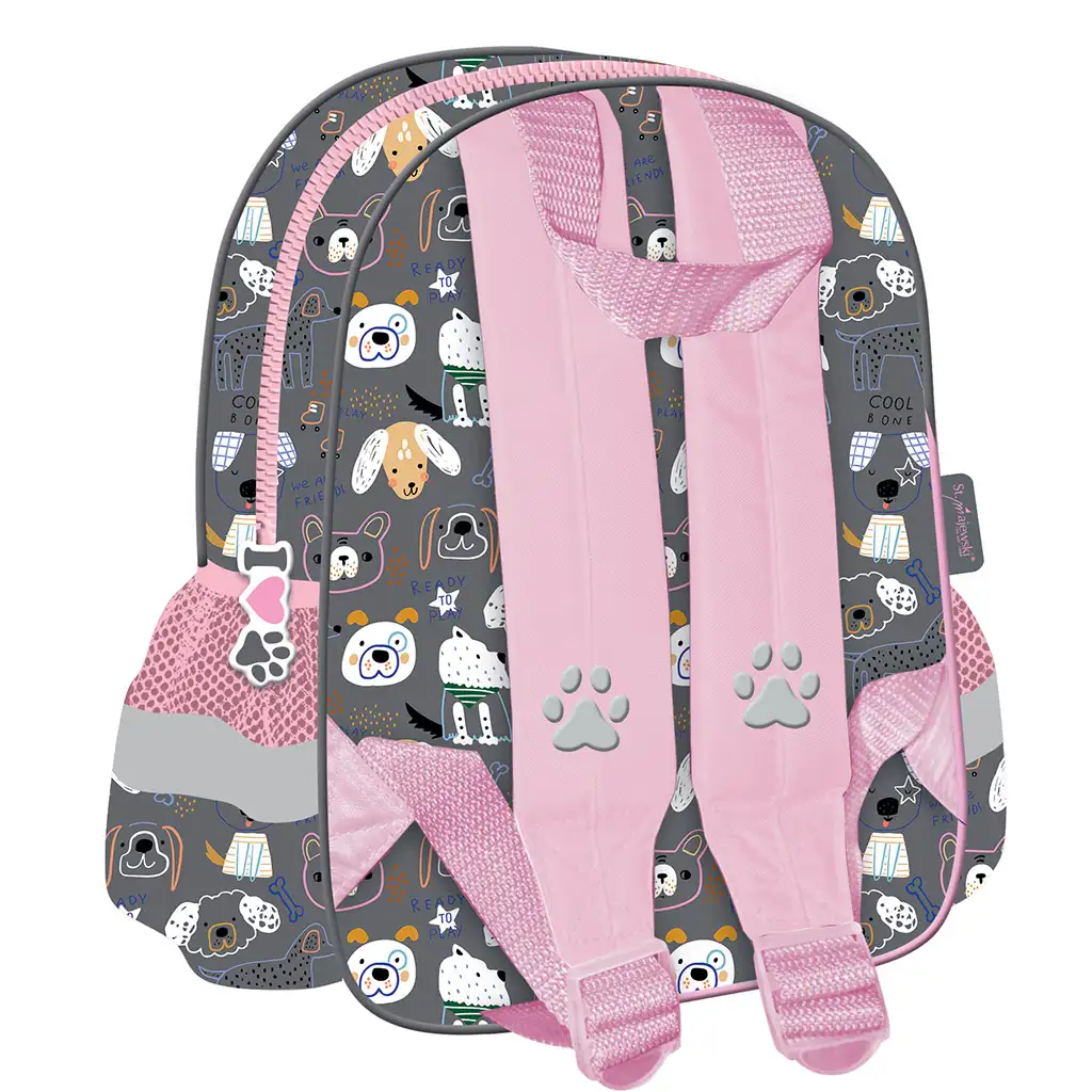 My Little Friend Sweet Pomeranian otroški nahrbtnik s pasjo tematiko v velikosti 28x25 cm je popolna izbira za vsakega otroka, ki obožuje hišne ljubljenčke. Ta prikupen nahrbtnik s svojim veselimi, igrivimi motivi in sliko prijaznega pomeranskega psa zagotovo očara vsakega malčka. Roza in sivo barvno kombinacijo dopolnjujejo simpatični pasji tačkami na zadrgah in drugi motivi s kužki, ki nahrbtniku dajejo ljubek videz z vseh strani. Veseli pasji motivi in srčki zagotovo bodo razveselili otroke med dnevi v vrtcu.