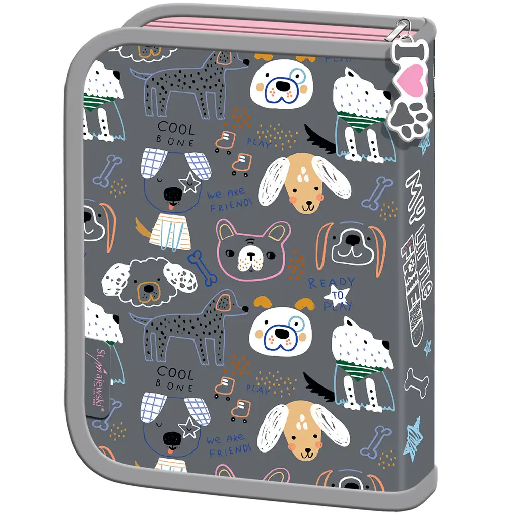 My Little Friend pasja izskočna peresnica je popolna izbira za vse male ljubitelje živali, ki obožujejo kužke! Na eni strani peresnice nas s svetlečimi očmi in nasmehom z roza ozadjem, okrašena s srčki in veselimi grafikami, gleda prikupen pomeranski kužek, medtem ko drugo stran krasijo vesele pasje motive in igrivi napisi (npr. »Ready to play«, »Cool bone«), ki poskrbijo za še prijetnejšo uporabo. Siva in roza barvna kombinacija daje peresnici moderen in prijazen videz, ki ga bo vaš otrok z veseljem nosil v šolo.