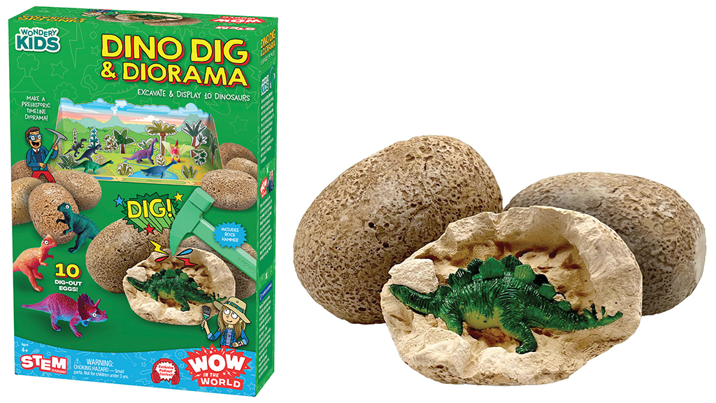 Teleskop ima kakovostne leče, nastavljivo širino, mehke očesne školjke in kolo za nastavitev fokusa. Osemstranski priročnik spremlja napredek otrok med naravoslovnim lovom na zaklad, medtem ko poslušajo voden izlet na prostem z voditelji oddaje Wow in the World, Guyem Razom in Mindy Thomas. Ta teleskop ne le da naredi odkrivanje narave razburljivo, ampak tudi pomaga otrokom pri učenju, medtem ko na zabaven način spoznavajo svoje okolje.Komplet vsebuje 10 jajc, skozi katera lahko kopljemo, da odkrijemo figurice dinozavrov. Otroci lahko sestavijo kartonsko dioramo, da ustvarijo razstavo dinozavrov v muzeju. Ta dejavnost ni le zabavna, ampak tudi poučna, saj se otroci spoznavajo s svetom dinozavrov, medtem ko razvijajo svojo ročno spretnost in ustvarjalnost. Komplet je lahko idealna izbira za rojstnodnevno darilo ali skupno družinsko dejavnost.