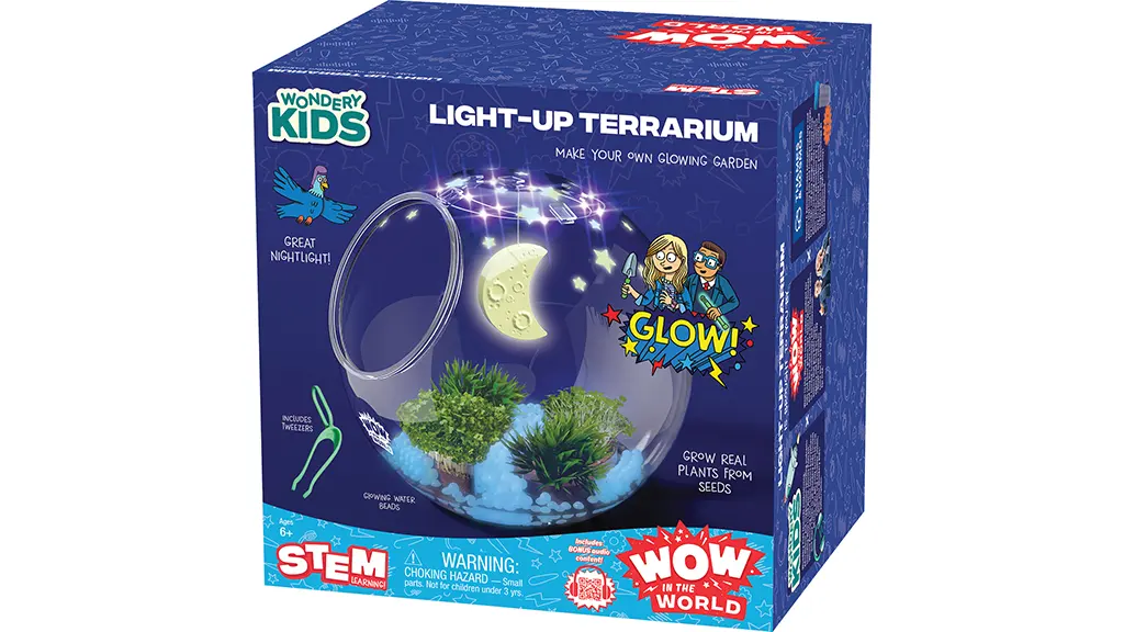 Zbirka je na voljo na spodnjih povezavah in pri izbranih trgovcih, kot je na primer Barnes & Noble. Želimo vam prijetno zabavo — v imenu znanosti!Komplet vsebuje semena kreše, "posode za rast", "zvezde, ki svetijo v temi", svetleče plastične kamenčke, UV LED svetlobno verigo in umetne rastline. Mladi botaniki lahko sledijo eksperimentalnemu vodniku za izdelavo terarija in učenje o rastlinah. Ta komplet ni le zabaven, ampak tudi poučen, saj otroci spoznavajo proces rasti rastlin, fotosintezo in vplive okoljskih dejavnikov. Svetleči elementi dajejo terariju poseben ambient, tako da lahko otroci uživajo v pogledu na svoj mali vrt tudi ponoči.