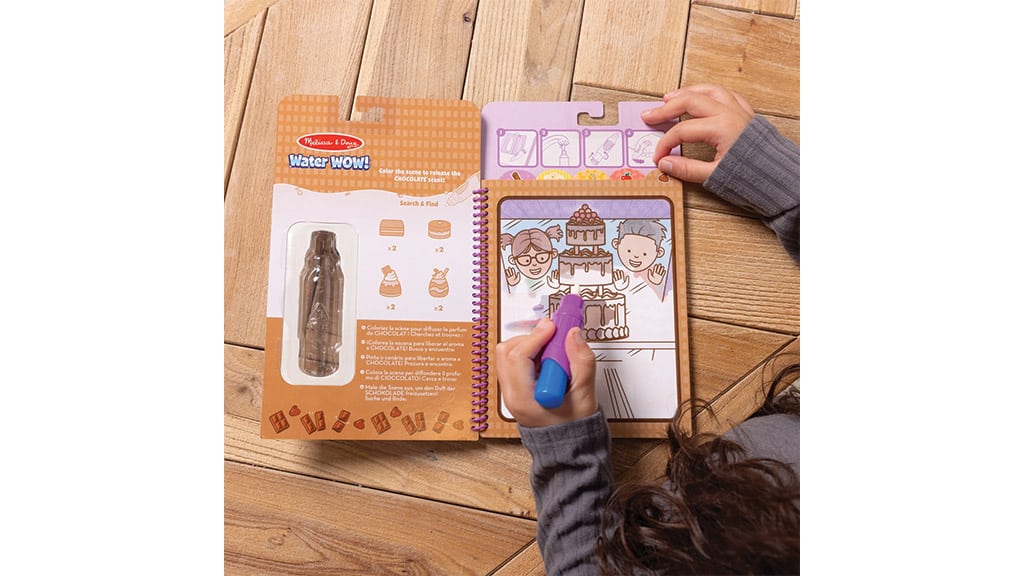 Otroci lahko uporabljajo ponovno polnljivo vodno pisalo, ki je posebej zasnovano za majhne roke, da z vodo barvajo strani in ob tem odkrivajo prijetne vonjave. Strani so večkrat uporabne, tako da ko se voda posuši, se lahko otroci znova in znova igrajo z njimi. Na voljo z motivi Treats (sladkarije) ali Fruits (sadje).